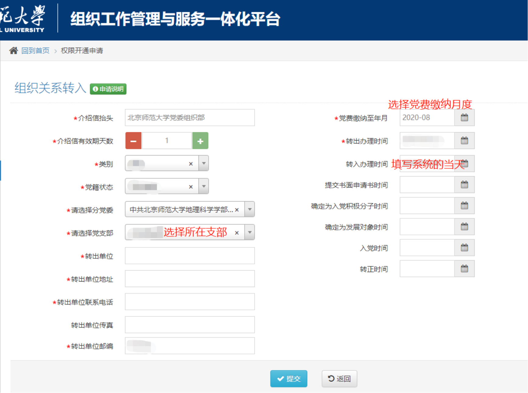 ●京外转入:提交纸质版介绍信后,地理学部党委将通过介绍信内容统一进行北京市党建平台的信息录入。
