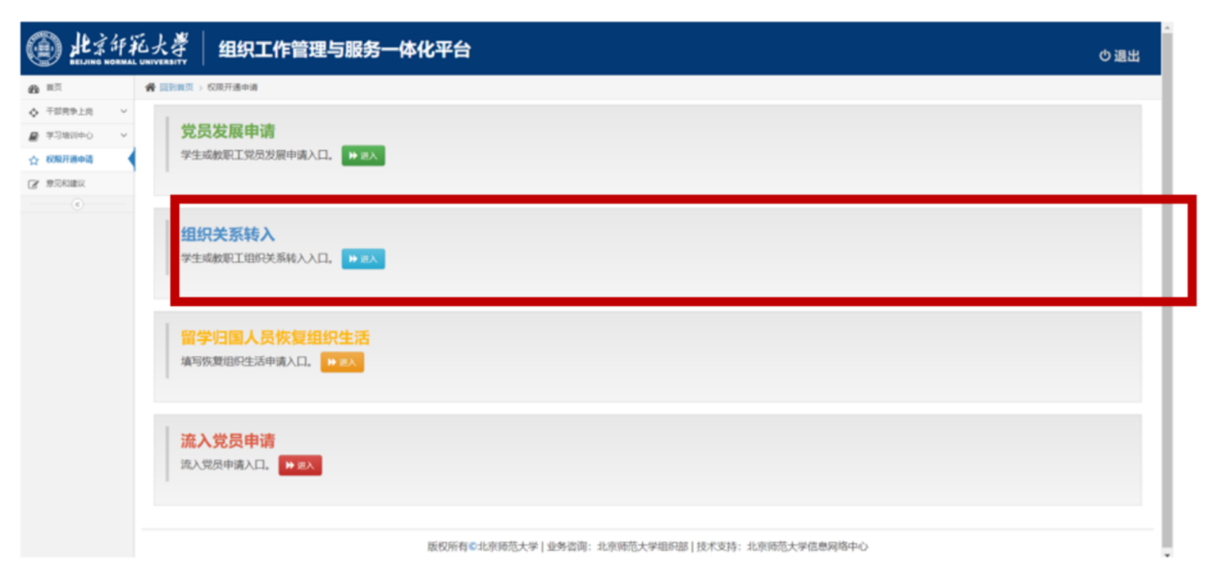 在学校组织工作管理一体化平台(zzbgz.laosijiforum.net)中填写转入信息。用户名和密码与本人信息门户登录信息一致,也可以从学校官网-信息门户-左侧“常用应用”的“组织工作管理系统”中登录。登陆系统后,选择“权限开通申请”——“组织关系转入”,按照介绍信内容,填写本人基本信息及组织关系转入信息。学部党委和校党委组织部逐级审核后,即可完成转入。