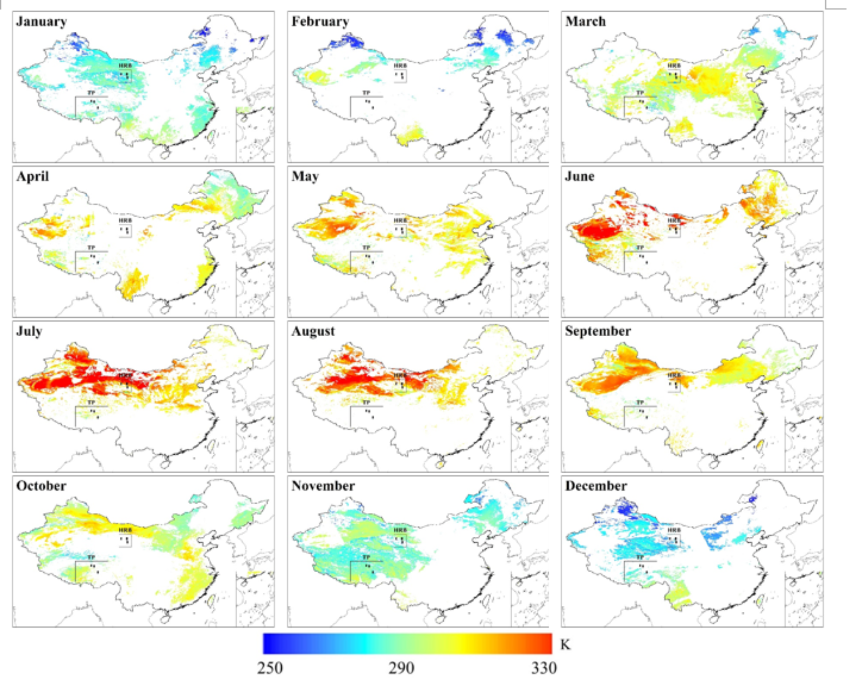 图3 由融合方法生成的2014年每个月15日白天的地表温度。