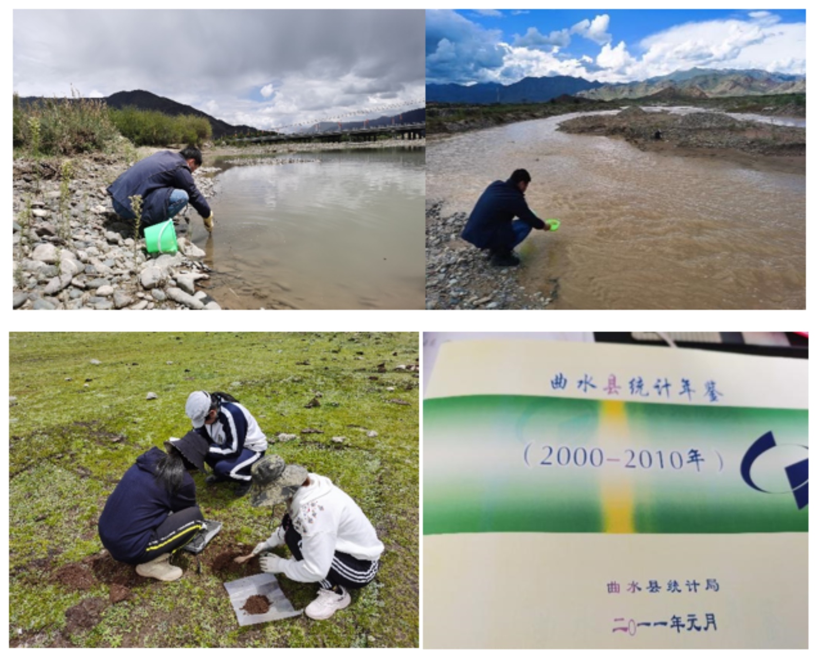“拉萨河流域水质土壤植被考察”小队对拉萨河流域开展了土壤污染效应考察。考察主要分土壤植被考察、水质底泥考察、灰尘采样和统计资料收集四个部分。考察过程主要是采集土壤植物样品、水质底泥样品和灰尘样品,在现场记录土壤的温度、湿度、电导率和水体的温度、pH值、电导率等指标,并将样品运送至相关实验室进行氮磷和重金属含量等相关指标分析。共计采集土壤样品133个、植物样品64个、水质样品73个、底泥样品66个、灰尘样品66个。科考小队还针对主要农业区进行了农业施肥污染的问卷调查和统计年鉴资料的收集,成功收集到拉萨河流域120份调查问卷和2市9县区的数据资料。