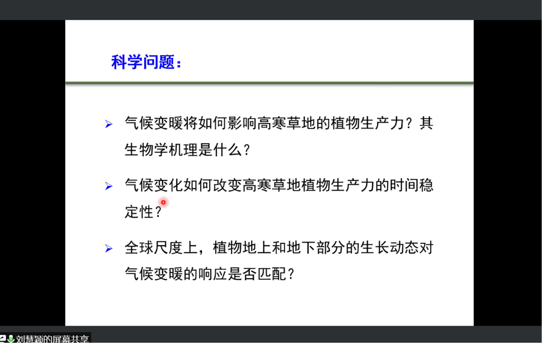 本次报告围绕气候变化下植物群落生产力的形成与维持机制,探讨了以下三个科学问题:1、气候变暖将如何影响高寒草地的植物生产力及其生物学机理是什么?2、气候变化如何改变高寒草地植物生产力的时间稳定性?3、全球尺度上,植物地上和地下部分的生长动态对气候变暖的响应是否匹配?刘慧颖老师向我们介绍了如何通过结合长期定位监测。野外控制实验等手段探讨气候变化对植物群落生产力及其稳定性的影响机制,以及通过利用整合分析手段,探讨陆地植物地上与地下物候对全球气候变暖的响应差异。