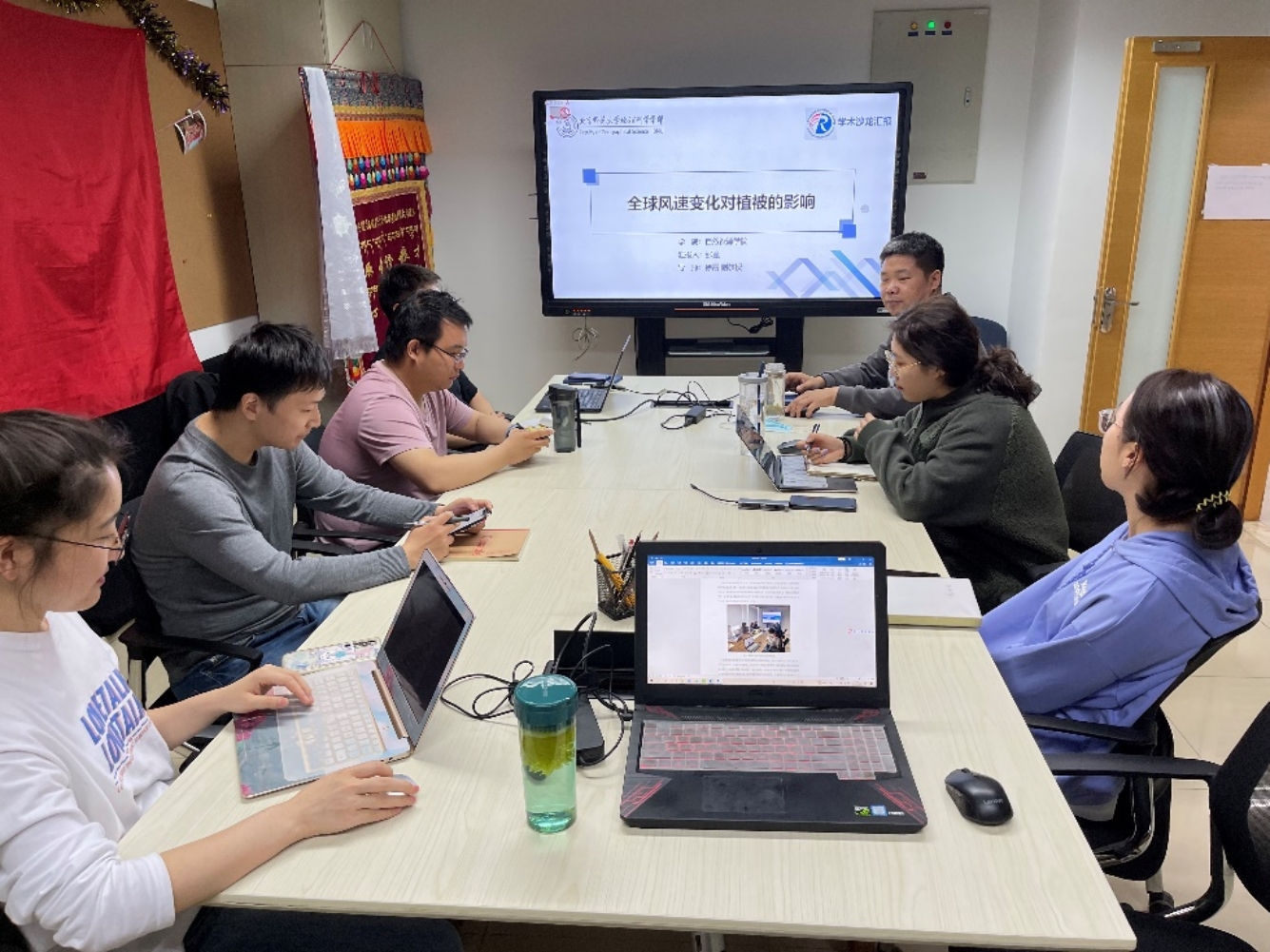 张童同学汇报的题目为“全球风速变化对植被的影响”,他以全球为研究区,通过收集大量数据,并进行数据的分析研究,提出三个拟解决问题:(1)1984年—2013年,全球植被在全球尺度上是退化了还是恢复了?(2)风速变化趋势如何?(3)年际尺度,风速对年际LAI的相对贡献率?,得出结果:(1)年均风速显著降低的区域占比42.32%,增加区域仅占24.83%,年均LAI增加区域占比86.24%(2)风速对植被变化的解释率分别为31.54%,,高于降水22.66%和温度27.96%;(3)如果模型考虑风速效应,气候对植被生长的解释将增加8.14%。汇报完毕张童同学和在场人员展开了讨论,董满宇老师对张童同学的研究进行指导与建议。