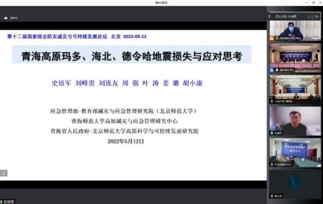 应急管理部—教育部减灾与应急管理研究院副院长、国家减灾专家委副主任史培军教授应邀主持论坛,并作“青海高原玛多、海北、得令哈地震损失与应对思考”主题报告。史培军教授系统介绍了青海高原近期三次地震的基本概况,重点分析了青海高原地震对地质环境、水文环境、冻土环境造成的总和影响,并从地震活跃期和地质构造带对青海高原地震灾害风险进行了预估,同时从地震活动监测、灾害链应对和灾害恢复重建等方面提出了相应的防范建议。报告还特别强调了在国家生态屏障的青藏高原,对其地震造成的损失评估时,要包括地震造成生态系统价值损失的评估