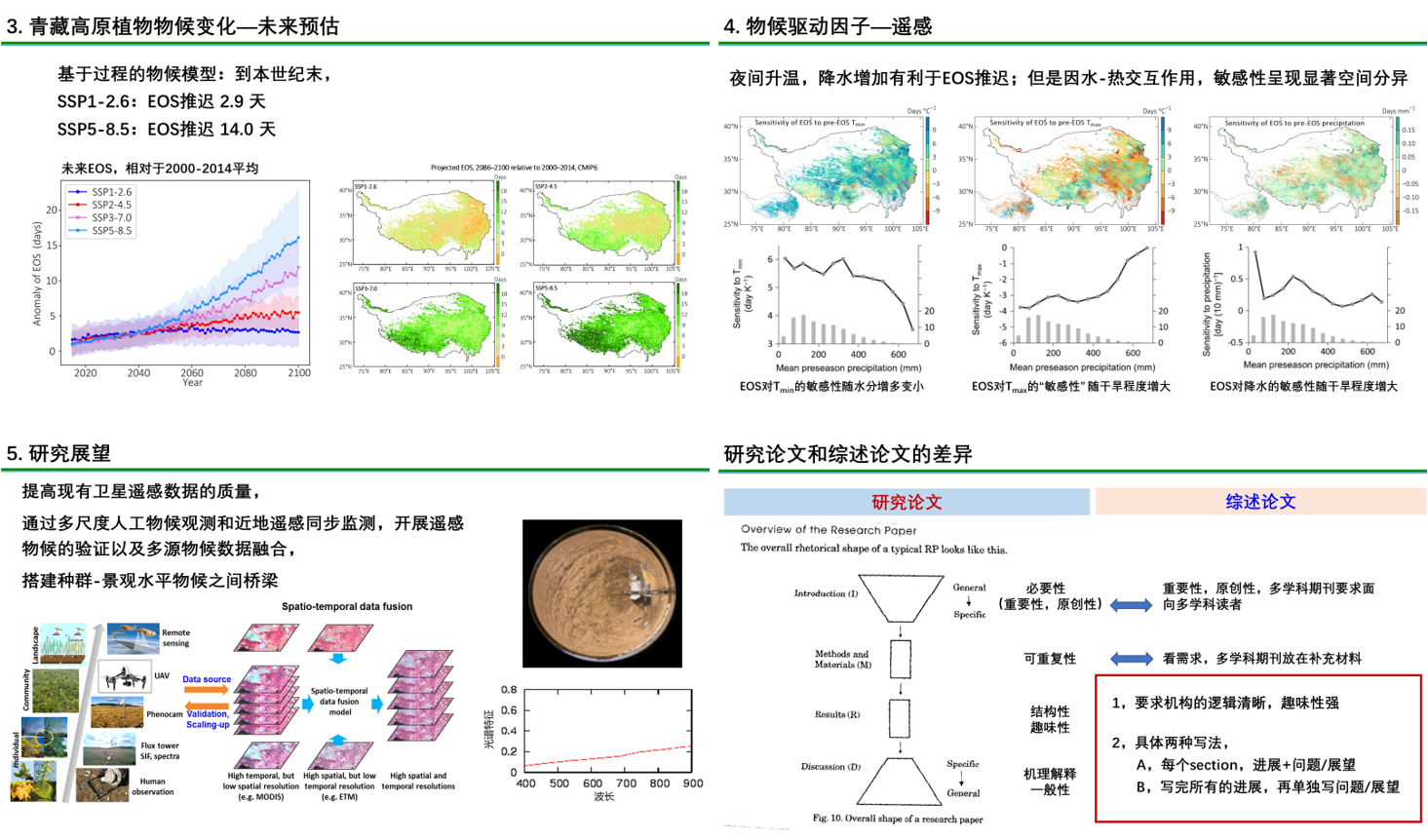 沈妙根教授介绍了Nature Reviews Earth & Environment综述论文《Plant phenology changes and drivers on the Qinghai–Tibetan Plateau》(青藏高原植物物候变化及驱动机制)(文章链接://www.nature.com/articles/s43017-022-00317-5)。报告中,沈妙根教授介绍道,基于遥感观测结果,青藏高原植物生长季开始期(SOS)在1982-1999年间提前了9.4±2.2天,在2000-2020年间提前了8.3±2.0天;生长季结束期(EOS)在1982-1999年间无显著变化,在2000-2020年间推迟了8.2±1.9天。温度的升高和降水的增加是SOS提前和EOS推迟的主要驱动因素,但温度和降水变化对青藏高原物候的影响表现出较强的空间不均一性。