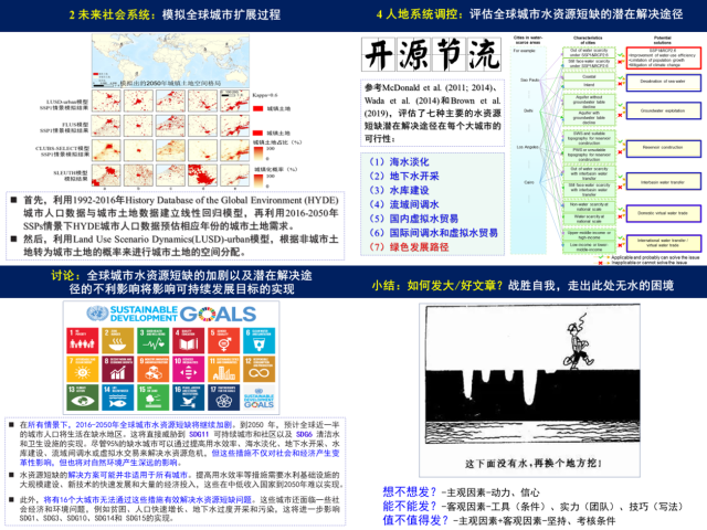 何春阳教授基于Nature Communications论文《Future global urban water scarcity and potential solutions》,(文章链接://www.nature.com/articles/s41467-021-25026-3)作了题为“全球流域城市扩展过程的水压力研究”的学术报告。报告中,何春阳教授介绍了通过评估全球城市水资源短缺现状、趋势及其潜在解决途径的研究发现,给出了全球不同情景下2016-2050年水资源短缺区域中城市人口和土地的时空格局,发现全球水资源短缺区域中的城市人口呈现快速增加趋势,指出城市水资源短缺是当前实现联合国可持续发展目标的一个重要挑战,亟需科学协调全球水资源短缺区域中的人口增长和城市化过程。
