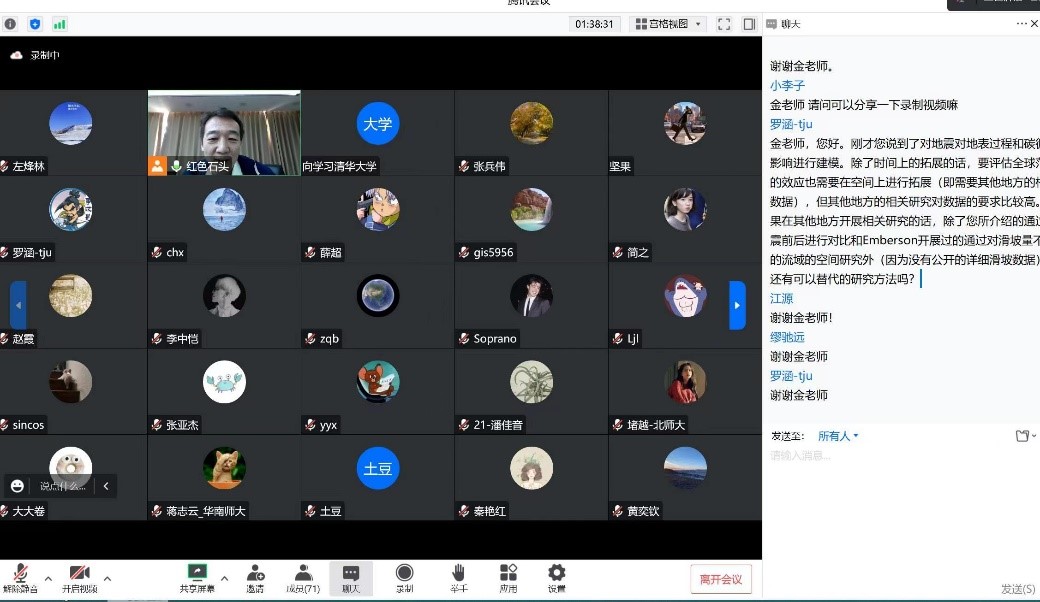 讲座最后,李小雁老师、杨晓帆老师、江源老师及参会同学就报告中的相关问题,与金章东老师进行了热烈的交流和讨论。针对同学们提问的地震前后河流有机碳沉积过程、沉积物磁化率测定及河流湖泊物理、化学和生物过程等问题,金老师细心向大家进行了解答。通过此次讲座,与会师生对极端事件与地表过程及碳循环关系研究有了深入认识,也从学科交叉方面受到很多启发,讲座取得预期效果。
