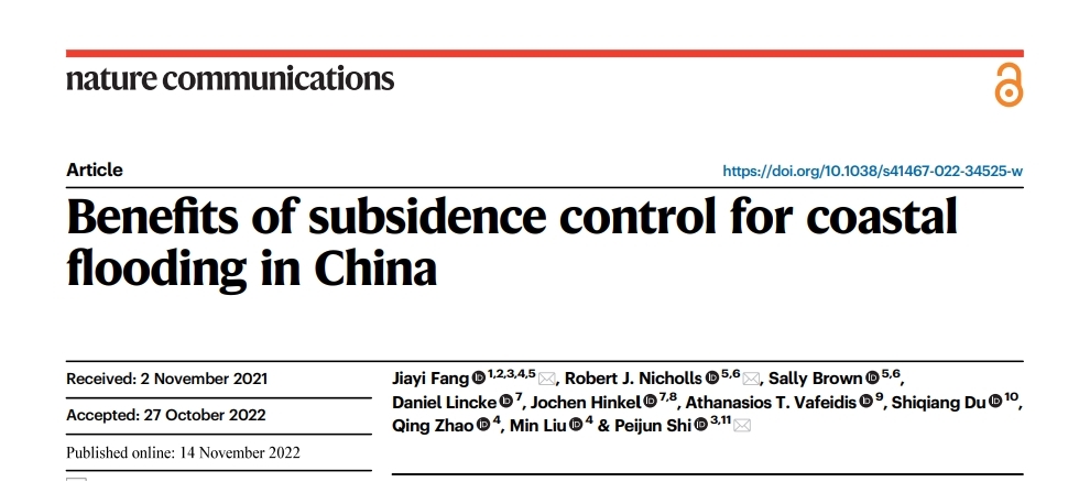 2022年11月14日,《自然-通讯》(Nature Communications)杂志在线发表了老司机论坛 史培军教授等合作团队、杭州师范大学方佳毅副教授作为第一作者的最新研究成果,论文题目是“Benefits of subsidence control for coastal flooding in China”,该工作定量评估并揭示了中国沿海地面沉降防控及其降低未来中国海岸洪水风险的成效。