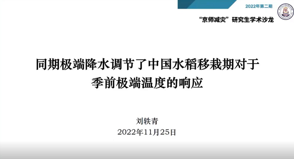 2020级硕士生刘轶青的报告题目为“同期极端降水调节了中国水稻移栽期对于季前极端温度的响应”。会上,刘轶青同学介绍了移栽期对温度的响应及极端降水的调节效应的影响机制,认为同期发生的极端降水通过影响作物生理过程及农户行为调节对于移栽期对极端温度的响应。研究加深了气候变化对物候影响的理解;对于作物模型模拟能力提升以及适应气候变化有重要指导意义,揭示了极端降水对温度调节的响应效用。