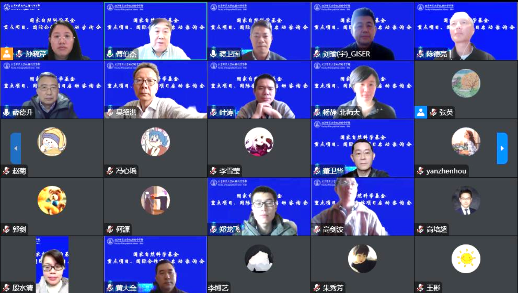 傅伯杰院士主持汇报环节和专家组指导环节,在傅院士的主持下,项目负责人董卫华教授、杨静教授、叶涛教授和研究骨干高培超讲师分别对国家自然科学基金重点项目“地理空间类脑智能导航基础理论与方法”,国家自然科学基金国际合作项目“基于统计(机器学习)-动力气候预测的伊朗农业旱灾风险季节预测研究”,国家自然科学基金国际合作项目“咖啡天气指数保险产品设计、偏好分析与政策效果评价:中国与埃塞俄比亚的对比研究与实践”和国家自然科学基金重点项目“基于大数据的区域高质量发展的判别方法研究”的研究背景与意义、研究内容与实施方案、项目特色与创新、项目预期成果与项目团队等方面进行了汇报。