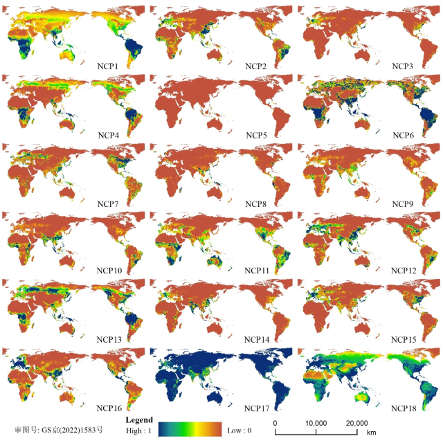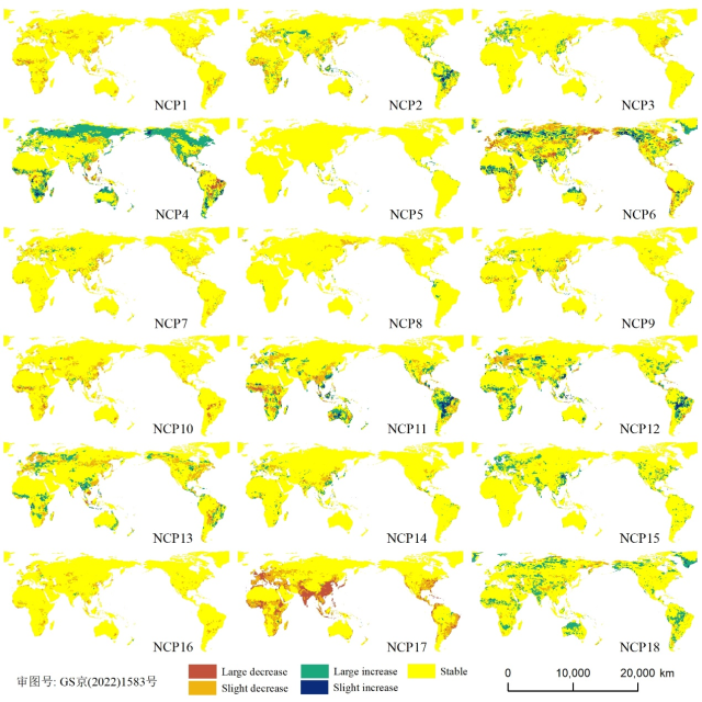 结果表明,全球大部分NCPs的高值仅在局地出现。1992年至2018年,6个调节型NCP、3个物质型NCP和2个非物质型NCP下降。这些NCP的减少基本可归因于自然生态系统的丧失。相比之下,其他NCP的增加可能并不是由于生态系统的恢复,而是气候变暖和人类利用资源的能力提升所致。