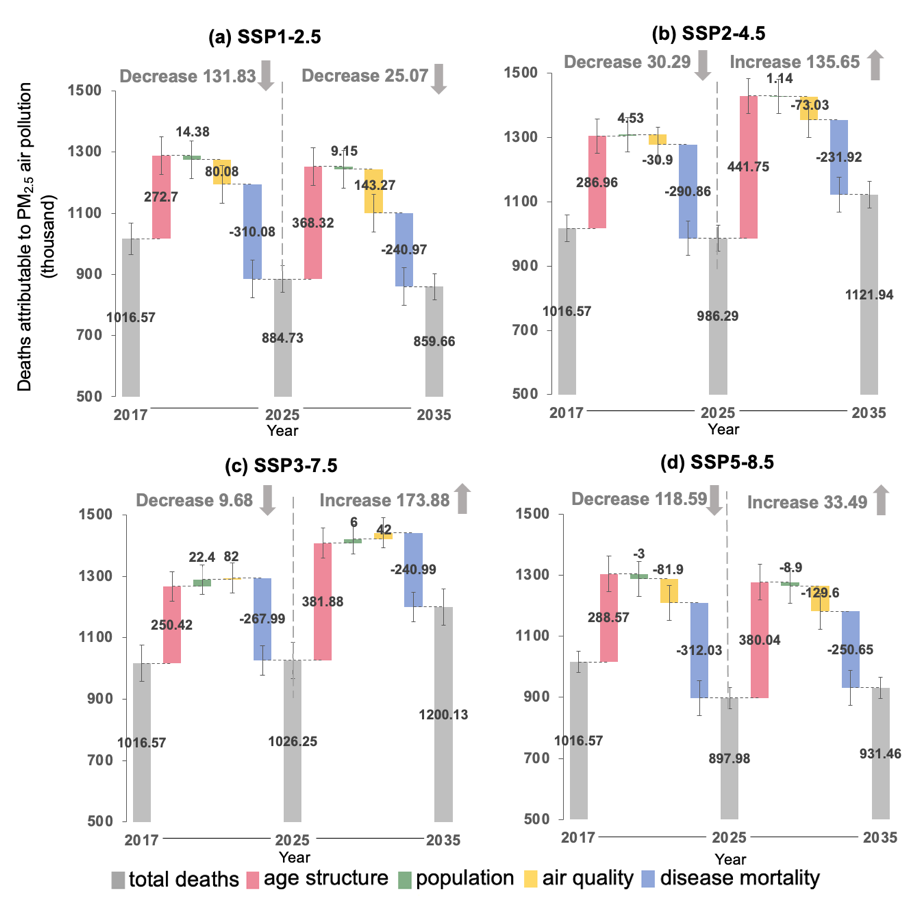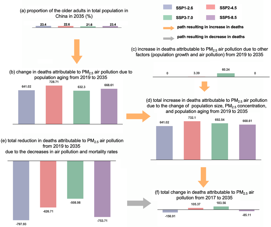 2023年8月26日,学部自然资源学院黄庆旭副教授团队在《自然·通讯》在线刊出了题为“The challenge of population aging for mitigating deaths from PM2.5 air pollution in China”的研究成果,该论文研究了不同发展情景下2000至2035年中国因PM2.5空气污染导致的死亡变化,揭示了中国当前面临的人口老龄化挑战对降低PM2.5污染导致的死亡人数(deaths attributable to PM2.5 air pollution, DAPP)有着关键影响。
