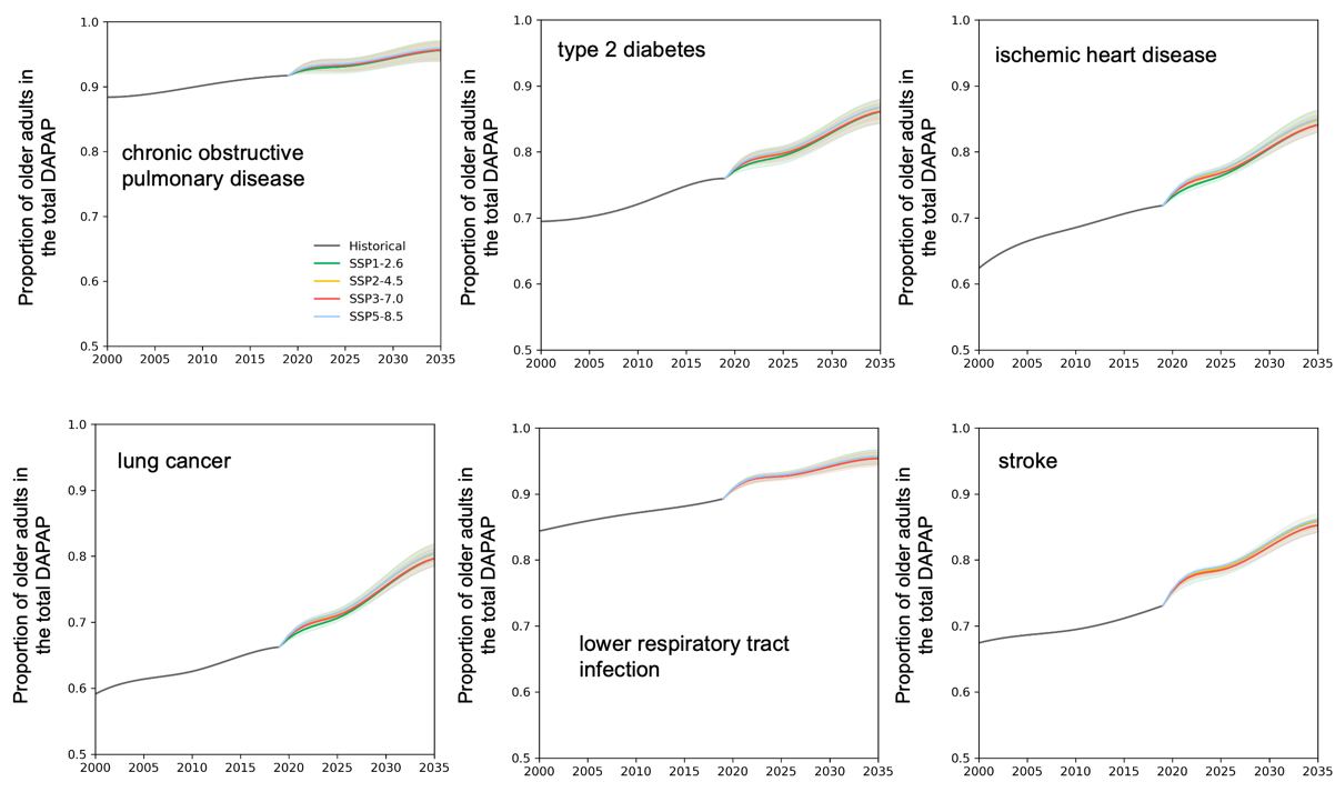 图3. 2000-2035年老龄人口六种不同疾病(慢性阻塞性肺病、肺癌、下呼吸道感染、缺血性心脏病、中风和2型糖尿病)的死亡比例变化,其中底纹阴影代表95%置信区间
