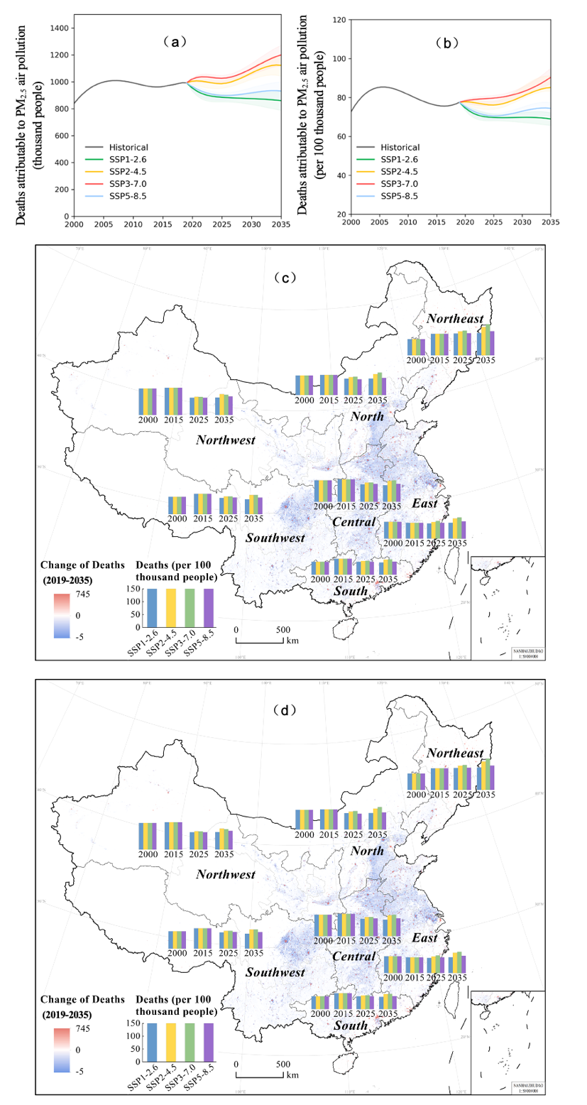 图1. 2000-2035年因PM2.5空气污染导致的DAPP变化趋势。其中,该图展示了DAPP总量变化(a)及地区间变化(c);人均DAPP变化(b)及地区间变化(d)。各地区数值为该地区各省间的平均值。