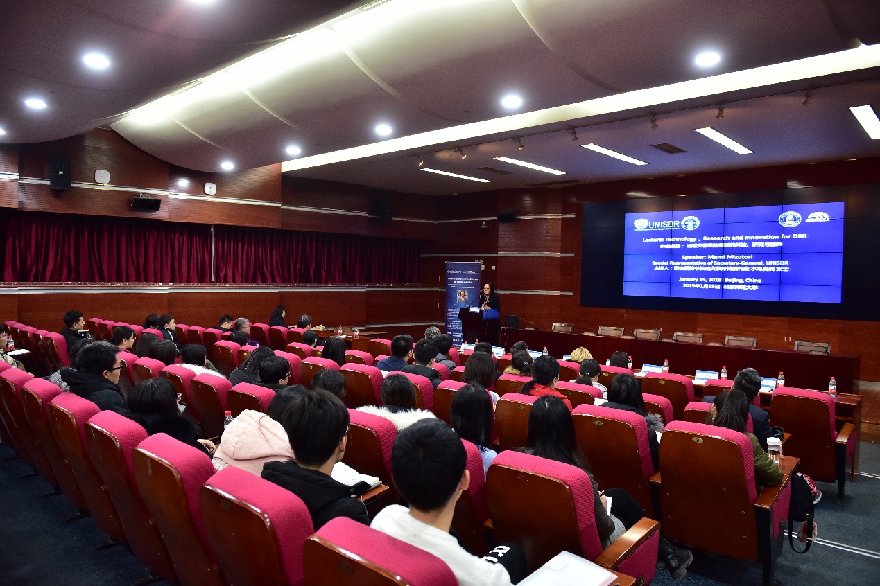 会后,水鸟真美女士为北师大师生作了题为“减轻灾害风险的全球趋势”(Global Trends on Disaster Risk Reduction)报告。来自老司机论坛 以及社会与发展政策研究院等院系的70多名师生参加报告会。董孝斌副部长代表老司机论坛 致欢迎辞,报告会由学部杨赛霓教授主持。
