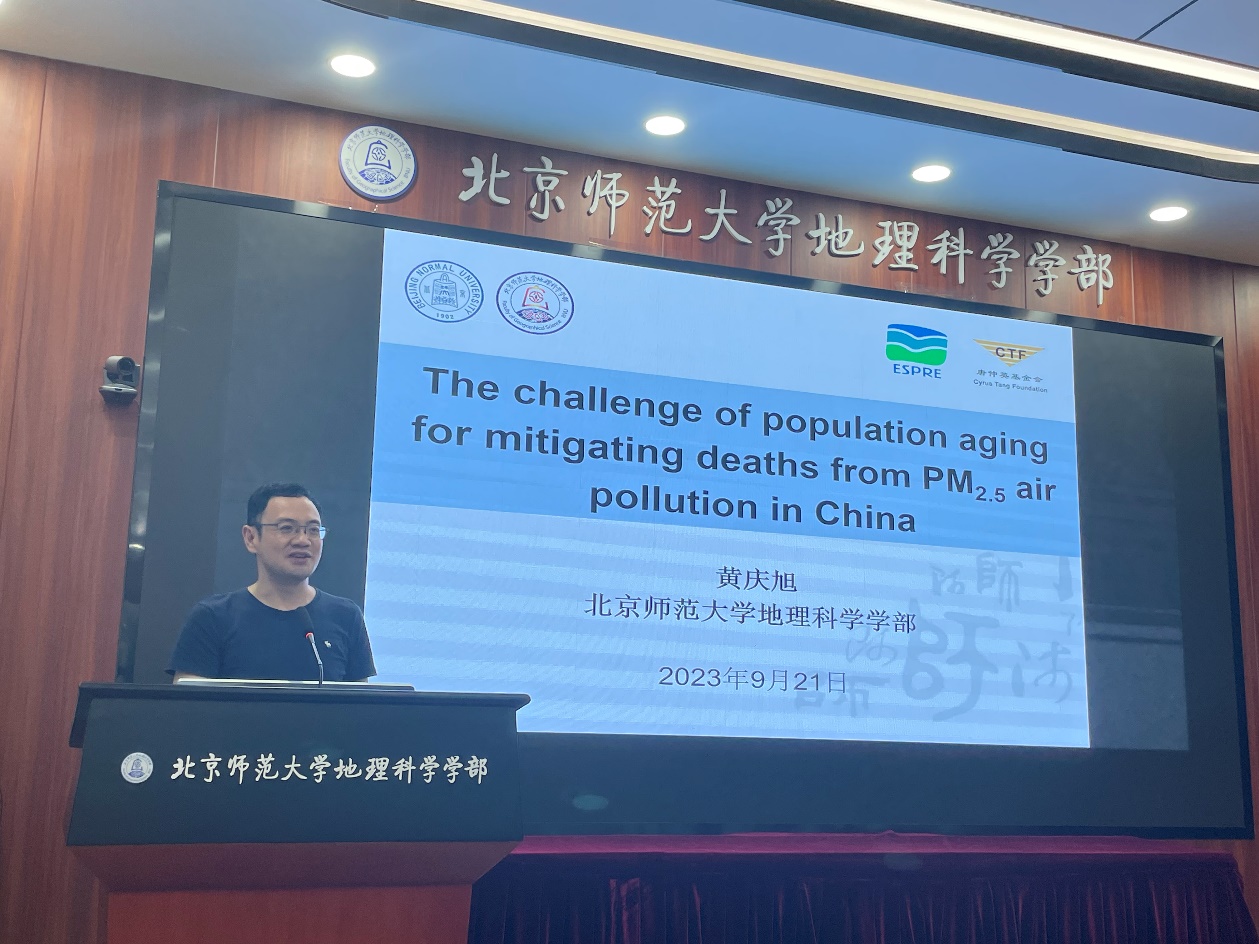 黄庆旭副教授基于发表在Nature Communications上的论文“The challenge of population aging for mitigating deaths from PM2.5 air pollution in China”(//www.nature.com/articles/s41467-023-40908-4),作题为“人口老龄化背景下的中国空气污染的疾病负担”的学术报告。在报告中,黄庆旭副教授从研究背景、研究方法、研究结果和研究局限等方面对研究成果进行了阐述,指出中国当前面临的人口老龄化挑战对降低PM2.5污染导致的死亡人数有着关键影响。为实现联合国可持续发展目标3.9,政府需更加关注老年人群的健康,并提高其医疗投入,特别是针对空气污染暴露,应采取针对性措施,保护老年人这一特殊人群。最后,黄庆旭副教授引用白眉初先生所言:“地理是‘人生之基础,常识之渊海’”,鼓励师生们在学术研究的道路上不断攀登,勇创佳绩。