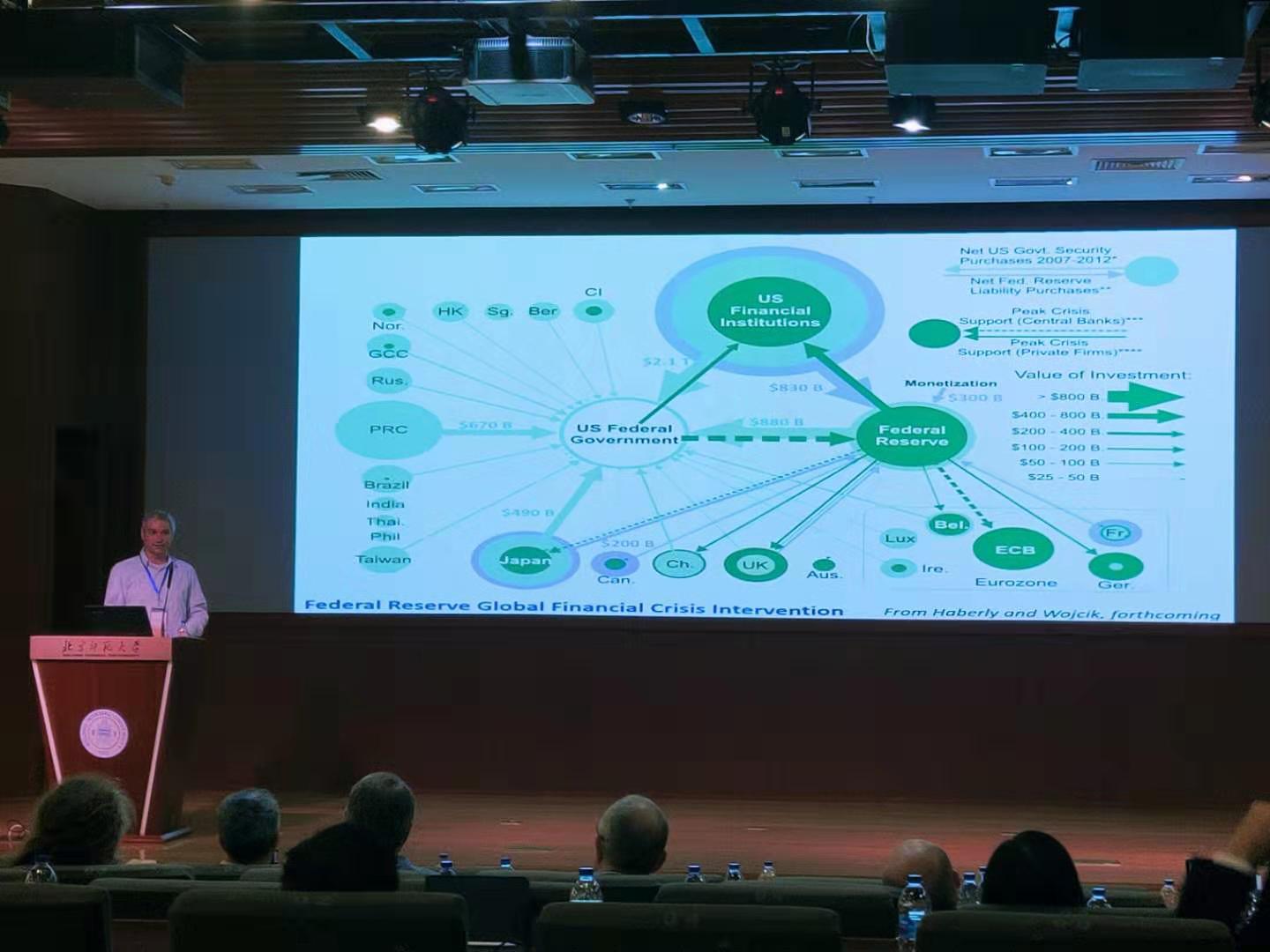 Dariusz Wójcik和Daniel Haberly从不同角度作了题为“粘性力量:世界经济中的全球金融网络(Sticky Power: Global Financial Networks in the World Economy)”的报告。他们认为,金融和商业服务网络、世界各国政府、金融中心、海外司法管辖区等要素相互影响形成了全球金融网络。银行、保险公司、法律会计和咨询公司在内的金融和商业服务公司(FAB)是全球金融网络(GFNs)的主要编织者,为全球化和金融化进程提供便利。在理解全球金融网络时,应强调地缘政治、法律和监管以及规模和范围经济的作用。他们的研究从全球金融网络的视角建立了一个新的分析框架阐述并试图解答三个问题:美国到中国的权力转移为何如此缓慢?全球金融危机冲击后,金融机构依然如此强大,金融中心和离岸金融蓬勃发展了吗?技术能加速这种转变并扰乱现有的权力结构吗?。金融和商业服务网络、世界主要国家的政府、金融中心和海外司法管辖区等地区,通过相互密切联系构成世界经济的中心,从而拥有了金融、经济、政治和文化权力。从全球金融网络的角度分析世界经济,有助于理解我们为什么仍然生活在“漫长的二十世纪”。