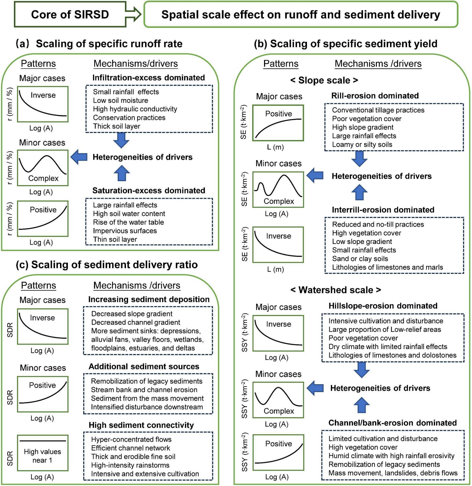 该研究认为,水沙运移中的尺度问题源自于径流和泥沙跨尺度输移过程的非线性特征与人类现有测量手段难以捕捉这种非线性特征之间的矛盾。径流深或径流系数 (r)、侵蚀模数 (SE)、输沙模数 (SSY) 和泥沙输移比 (SDR) 的空间尺度效应在不同机制的作用下表现出不同的模式。超渗产流机制可以解释径流 (r) 与汇水面积 (A) 之间的反比关系,而蓄满产流机制可以解释径流 (r) 随汇水面积 (A) 增加而增加的正相关关系。在坡面尺度上,以细沟侵蚀过程为主导的情况下土壤侵蚀模数 (SE) 随坡长 (L) 的增加而增加,而细沟间侵蚀过程为主导的情况下土壤侵蚀模数 (SE) 随坡长 (L)的增加呈减小趋势。在流域尺度上,以坡面侵蚀过程为主的地区输沙模数 (SSY) 通常随汇水面积 (A) 的扩大而减小;但在沟道/河岸侵蚀过程为主的地区输沙模数 (SSY) 随汇水面积 (A) 的增大呈增加趋势。但随着流域面积的扩大,因下游沉积过程增强,一般而言泥沙输移比 (SDR) 会随汇水面积 (A) 的增大而呈减小趋势;而当下游额外出现大量沙源或侵蚀过程增强时,则会出现泥沙输移比 (SDR) 随汇水面积 (A) 的增大而增加的反常现象。土地利用、植被、地形、气候、岩性和土壤特征的空间分布变异性,可以导致这些尺度效应关系呈现出非线性的复杂模式。因此,不建议基于其他地区开发的经验方程来通过空间尺度大小估算侵蚀或输沙。此外,考虑到全球气候和土地利用的持续变化,现有的尺度效应模式或方程可能已经发生改变并且需要更新。