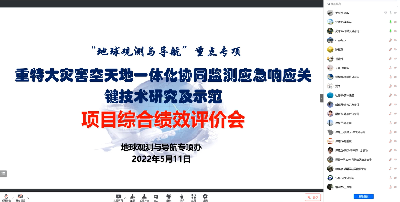在综合绩效评价会上,项目首席科学家武建军教授汇报了项目总体情况、任务书指标完成情况、成果水平及创新性、应用示范及推广情况,组织管理及档案归档情况。专家组认为,项目组按照任务书要求,开展了重特大灾害空天地一体化协同监测应急响应关键技术研发、集成平台研制和应用示范等工作,完成了任务书规定的研究内容,达到了考核指标要求,支撑了专项目标实施;项目成果在中国地震应急搜救中心、甘肃省地震局、水利部太湖流域管理局等单位实现业务化运行服务,为国务院办公厅、应急管理部、水利部、中国地震局、中国气象局等有关机构提供了应急决策信息服务;项目成果作为中国地球观测领域代表性成果连续三年在国际地球观测组织全会的中国展区展出,产生了显著的社会经济效益。专家组一致同意通过综合绩效评价,并建议今后加强项目成果在业务化服务中的推广应用。