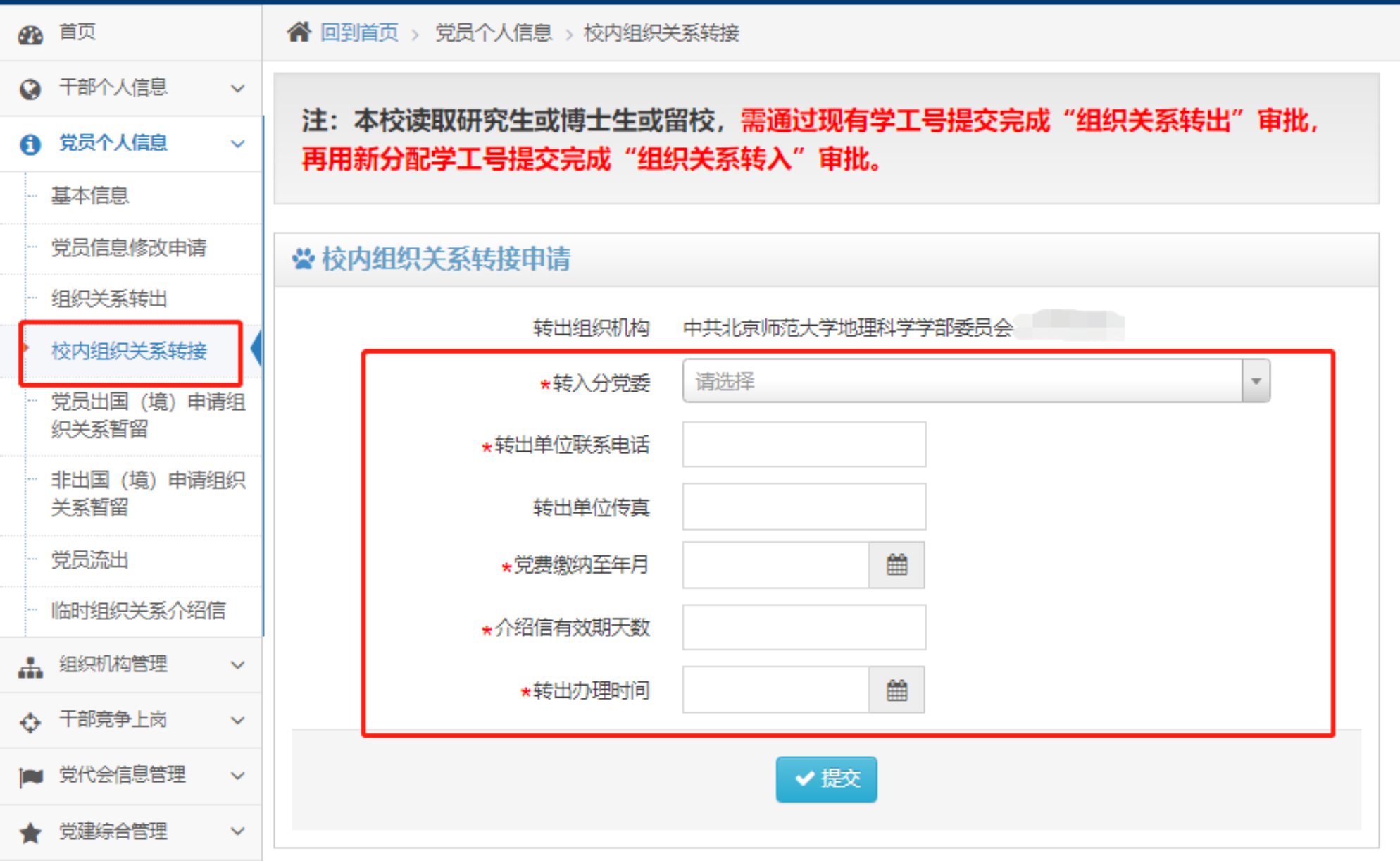 (1)操作:填写左侧的“党员基本信息—组织关系转出”信息并提交