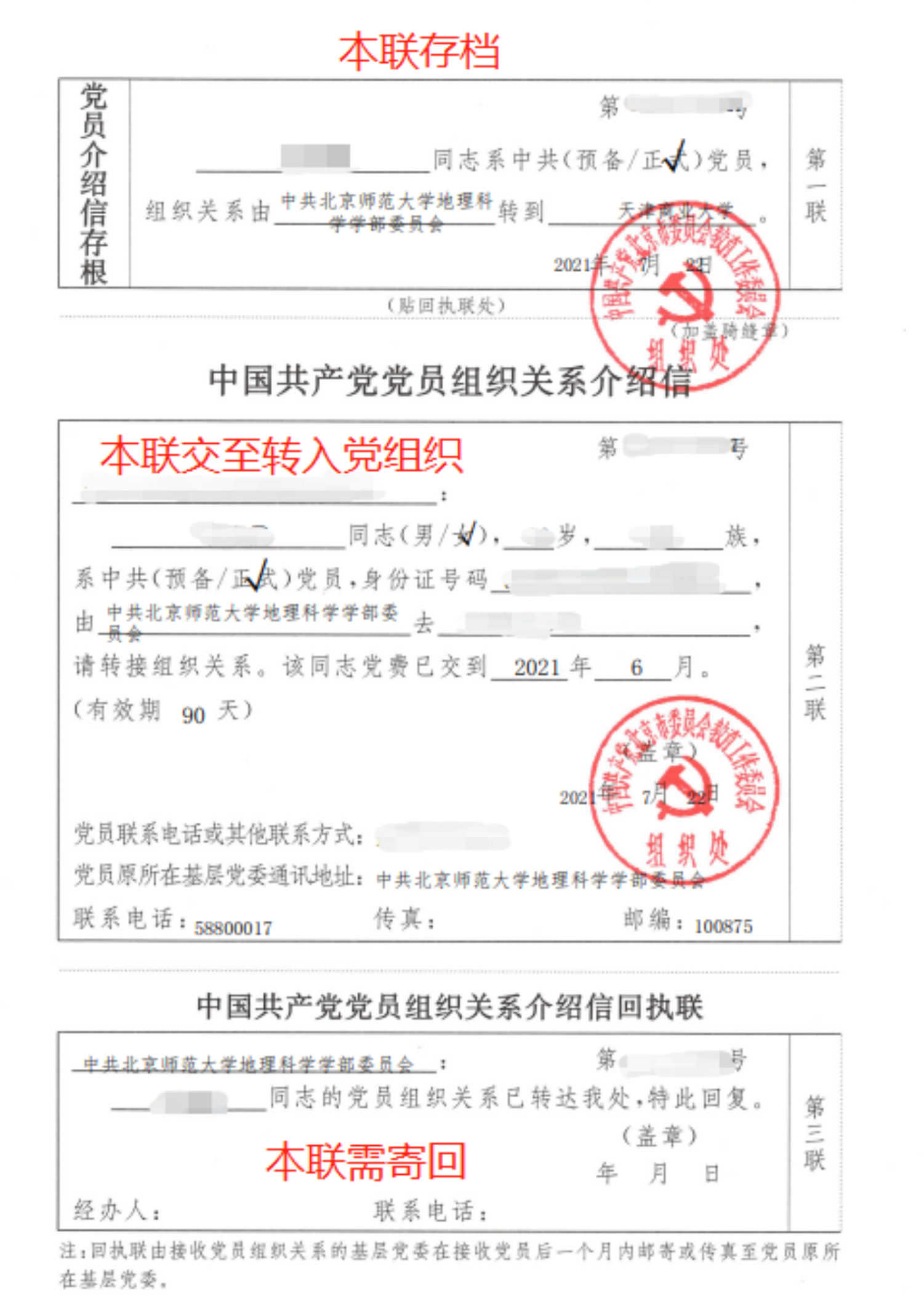 领取党组织关系介绍信后,请将介绍信的首联(存根)留在学部,第二联和第三联交给转入单位;第二联留在转入单位,第三联盖章后纸质版交回党务办公室(励耘学苑221);或者将盖章后第三联的电子版以“姓名+教职工介绍信回执”主题于转接完成有效期内发送至[email protected]。