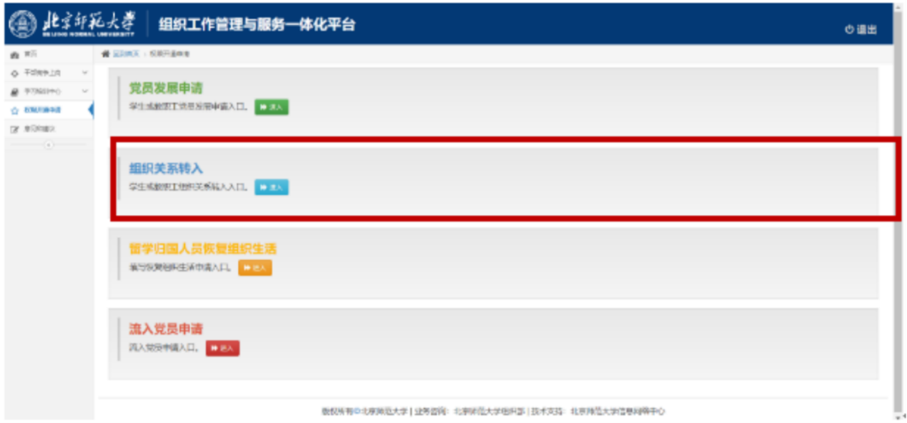 在学校组织工作管理一体化平台(zzbgz.laosijiforum.net)中填写转入信息。用户名和密码与本人信息门户登录信息一致,也可以从学校官网-信息门户-左侧“常用应用”的“组织工作管理系统”中登录。登陆系统后,选择“权限开通申请”——“组织关系转入”,填写本人基本信息及组织关系转入信息。学部党委和校党委组织部逐级审核后,即可完成转入。