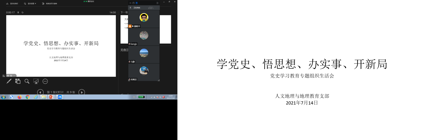 7月14日下午,人文地理与地理教育支部党史学习教育专题组织生活会生地楼351会议室顺利召开,部分出差党员老师以线上方式参加本次会议。