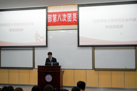 随后,校研究生会执行主席李炫志同学致辞。他首先对出席现场的学生代表及工作人员表示感谢,对学部研究生会过去一学年来的工作给予了高度认可,并对即将产生的新一届研究生会成员致以美好的祝愿。