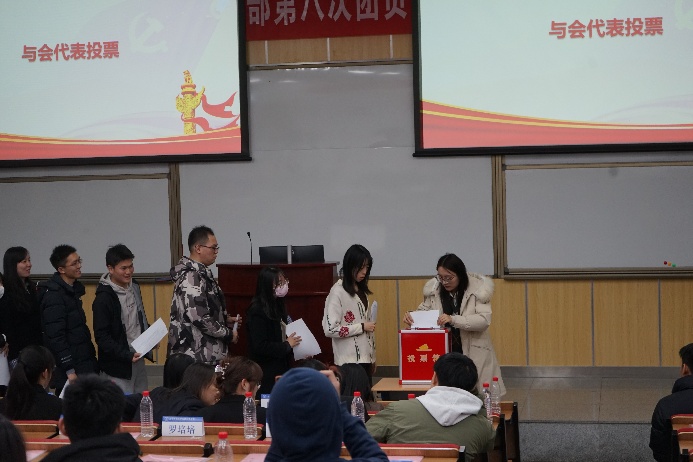 随后,大会进入第八届团委、研会学生干部选举环节,由总监票人李玉春主持。大会审议通过了选举办法、监票人、计票人名单,团候选人有序进行竞选演说,各代表团代表严格按照既定程序有序选举投票。
