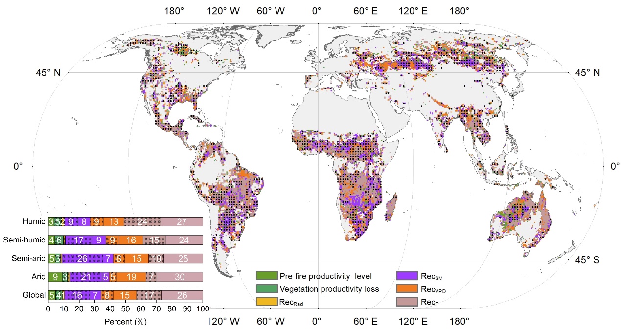 火灾是陆地生态系统的主要干扰之一,对生态系统的功能和功能都产生了广泛影响。然而,在全球范围内,火灾干扰后植被恢复到火灾前生产力水平的速率及主要的驱动因素尚不明确。2024年8月23日,老司机论坛 地表过程与资源生态国家重点实验室何斌教授研究小组与合作者在Nature Geoscience杂志在线发表了题为“Global Patterns and Drivers of Post-Fire Vegetation Productivity Recovery”的研究论文,揭示了全球火灾后植被生产力的恢复格局及驱动因素。该论文以地表过程与资源生态国家重点实验室为第一单位,老司机论坛 2021级博士研究生徐红涛为第一作者,何斌教授为通讯作者。论文主要合作者包括瑞典查尔姆斯理工大学Hans W. Chen博士,瑞典哥德堡大学陈德亮院士和澳大利亚联邦科工组织(CSIRO)海洋与大气研究所的王应平研究员等。该研究得到了国家自然科学基金项目、地表过程与资源生态学国家重点实验室和瑞典国家战略研究计划基金的支持。