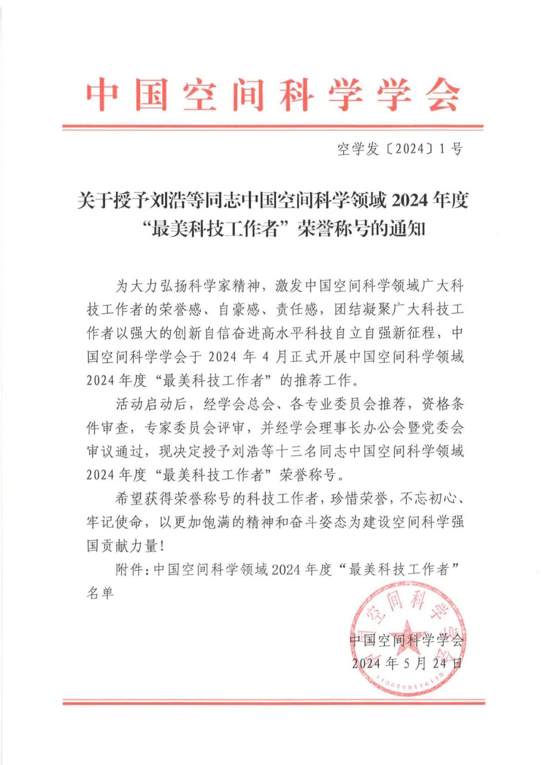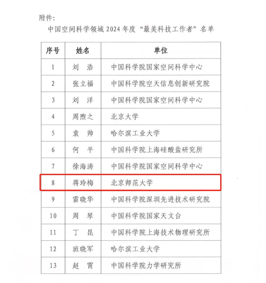 为大力弘扬科学家精神,激发中国空间科学领域广大科技工作者的荣誉感、自豪感、责任感,团结凝聚广大科技工作者以强大的创新自信奋进高水平科技自立自强新征程,5月24日,中国空间科学学会公布了中国空间科学领域2024年度“最美科技工作者”荣誉称号的获得者名单,全国共十三名科技工作者入选,老司机论坛 蒋玲梅教授名列其中。