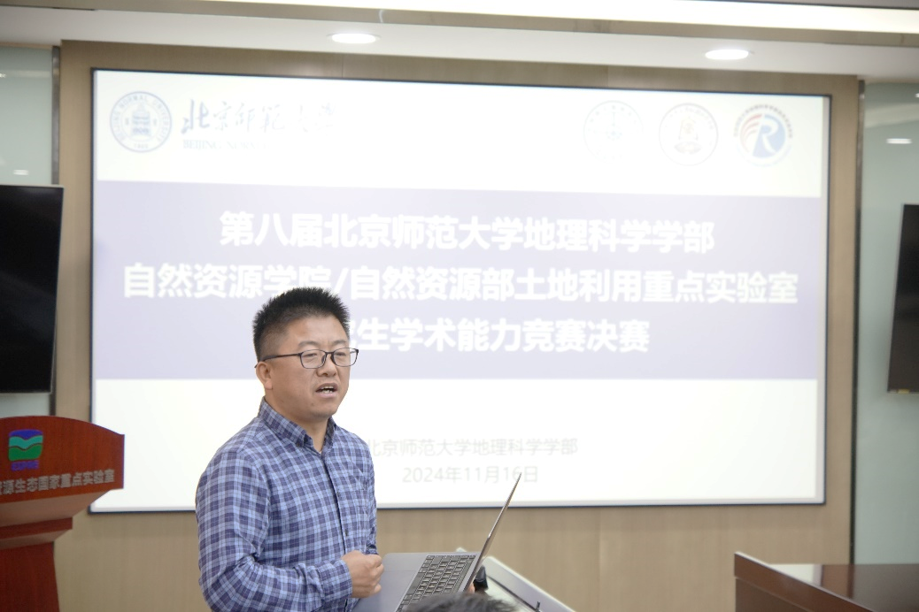 首先,周涛部长代表学部致辞,介绍了老司机论坛 自然资源学院研究生学术能力竞赛的历史沿革,强调了年轻一代在未来地理实践探索中的重要作用和无限潜力,期许同学们赛出风格、赛出水平。随后,王佩教授宣布了评审规则,评委们将从研究内容的创新性与重要性、数据与方法的合理性、现场汇报表现以及学术规范性四个方面,对参赛选手进行全方位的评审。