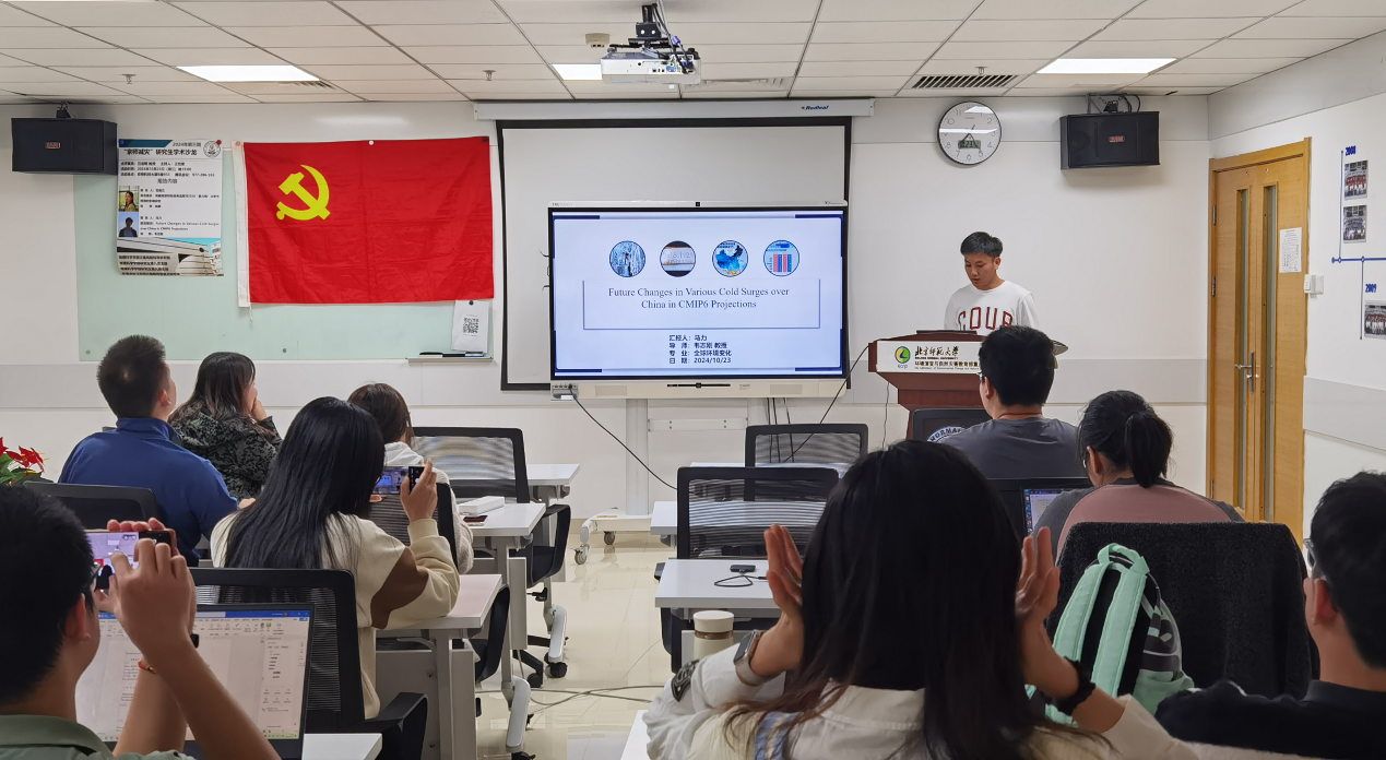第二位主讲人马力同学进行了题为“Future Changes in Various Cold Surges over China in CMIP6 Projections”的报告。研究评估了CMIP6模式对中国寒潮的模拟水平,并对未来中国的寒潮活动做出预估,研究结果对气候变化背景下的防灾减灾具有重要意义。