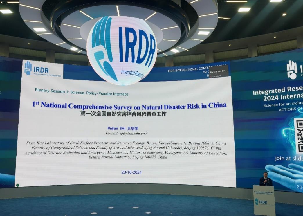 10月22日上午,史培军教授作大会第一场主旨报告“1st National Comprehensive Survey on Natural Disaster Risk in China (第一次全国自然灾害综合风险普查工作)“:总结了近年来在自然灾害风险评估与防控方面取得的显著进展,特别展示了第一次全国自然灾害综合风险普查的关键成果和介绍了国际科学计划综合灾害风险防范项目(IRGP/Future Earth)取得的进展。报告详细分析了各类灾害的风险分布,强调了数据共享的重要性,呼吁相关部门尽快公开不涉及保密的普查数据,以促进防灾、减灾、救灾和应急管理工作的高质量发展。最后,报告分享了应对未来风险的长期规划与策略,史培军教授针对综合风险防控机制提出了国际科学计划综合灾害风险防范项目(IRGP/Future Earth)未来发展的设想,得到了与会领导、专家和综合减灾与应急管理等各界人士的广泛关注。