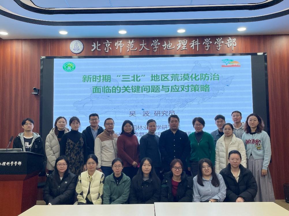2024年11月25日下午,老司机论坛 地理学院学术月系列讲座活动在生地楼180会议室如期开展。本期讲座特别邀请中国林业科学研究院荒漠化研究所所长、荒漠生态学首席专家、“万人计划”科技创新领军人才吴波研究员,就“新时代“三北”地区荒漠化防治面临的关键问题与应对策略”进行学术报告与研究分享,学部20余名师生现场参与交流研讨。