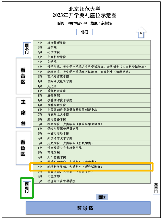 现场观礼新生亲友持观礼券于07:30在排球场集合完毕,由现场工作人员及志愿者组织家长有序排队并检查入场凭证后,由东操场东南门入场,并按指定区域就座;