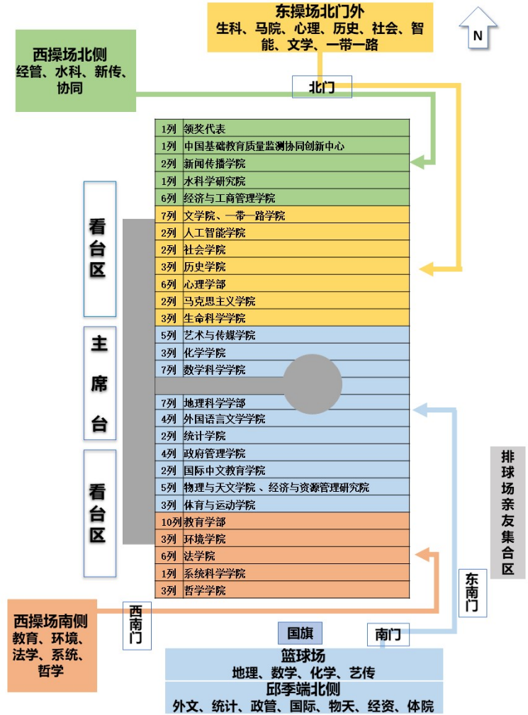 5.毕业生亲友于6:20前在排球场集合完毕,由现场工作人员及志愿者组织家长有序排队并检查入场凭证后,由东操场东南门入场,并按指定区域就座。