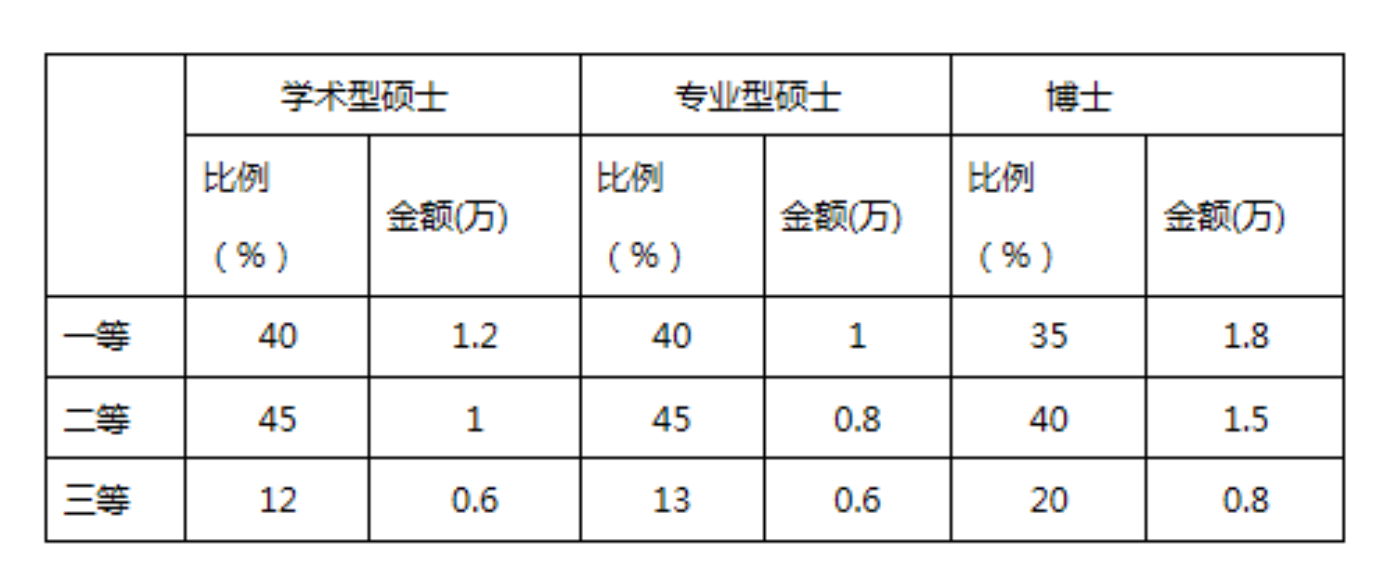 共设一等、二等、三等三个等级,博士的奖金金额分别为1.8万/人·年、1.5万/人·年和0.8万/人·年,硕士的奖金金额分别为1.2万/人·年、1万/人·年和0.6万/人·年。