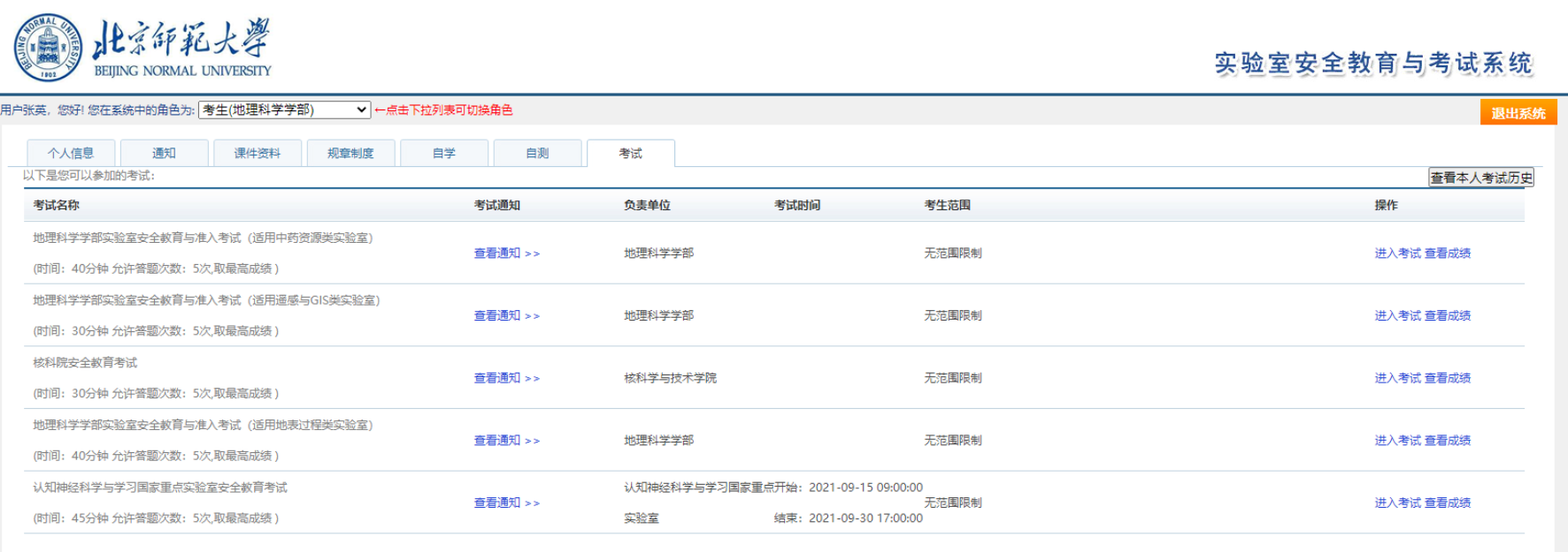 根据学部各实验室特点,分3类考题开展系统准入考试,即地表过程类、遥感与GIS类及中药资源类。请各位师生根据自身的需求,在“考试”菜单栏选择相应类别的试卷进行考试。