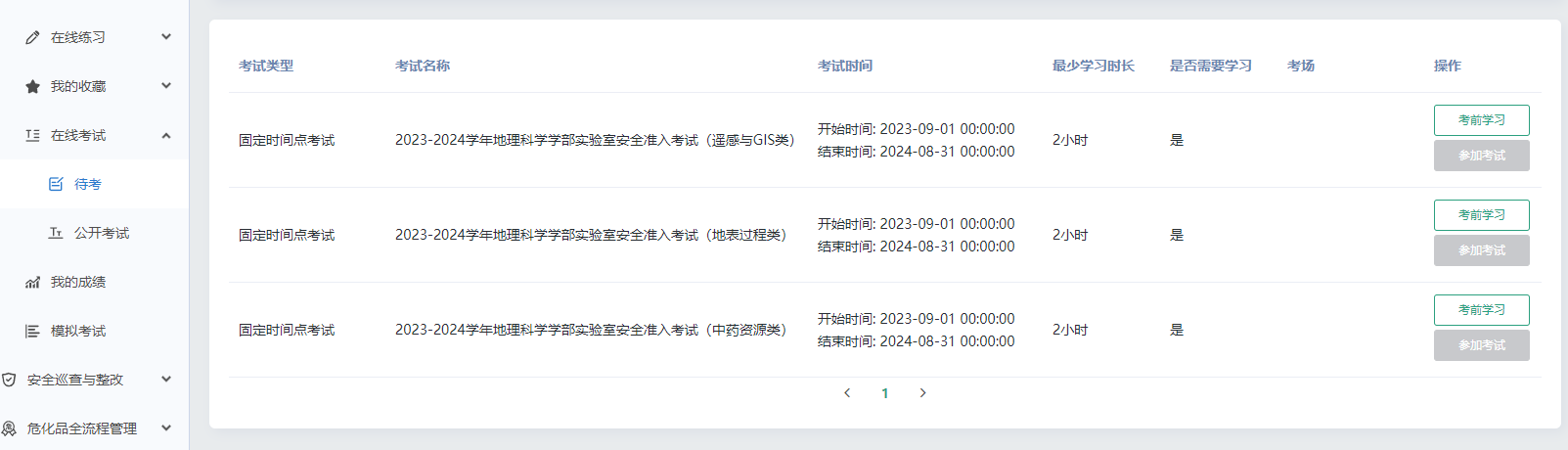 根据实验室的学科特点,学部分3类考题开展实验室安全准入考试,即地表过程类(适用于使用地表国重实验室及教学实验室的师生)、遥感与GIS类(适用于使用遥感国重实验室的师生)及中药资源类(适用于使用中药资源实验室的师生)。请各位师生根据自身的需求,在“在线考试-待考”菜单栏选择相应类别的试卷进行考试。请注意,考试前须完成2小时的考前学习,否则不能答题。考试成绩原则上达到总分90%以上为合格。