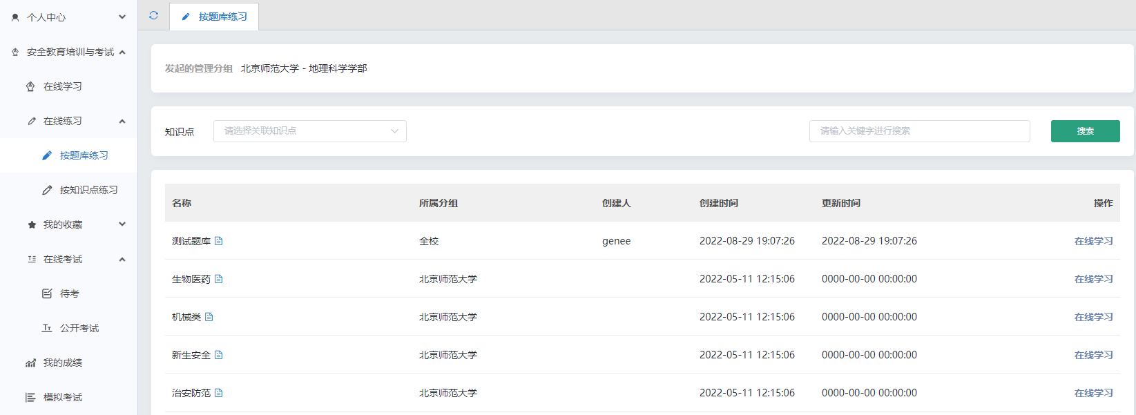 进入准入考试系统后,可通过“在线学习”“在线练习”浏览实验室安全相关资料及题库。