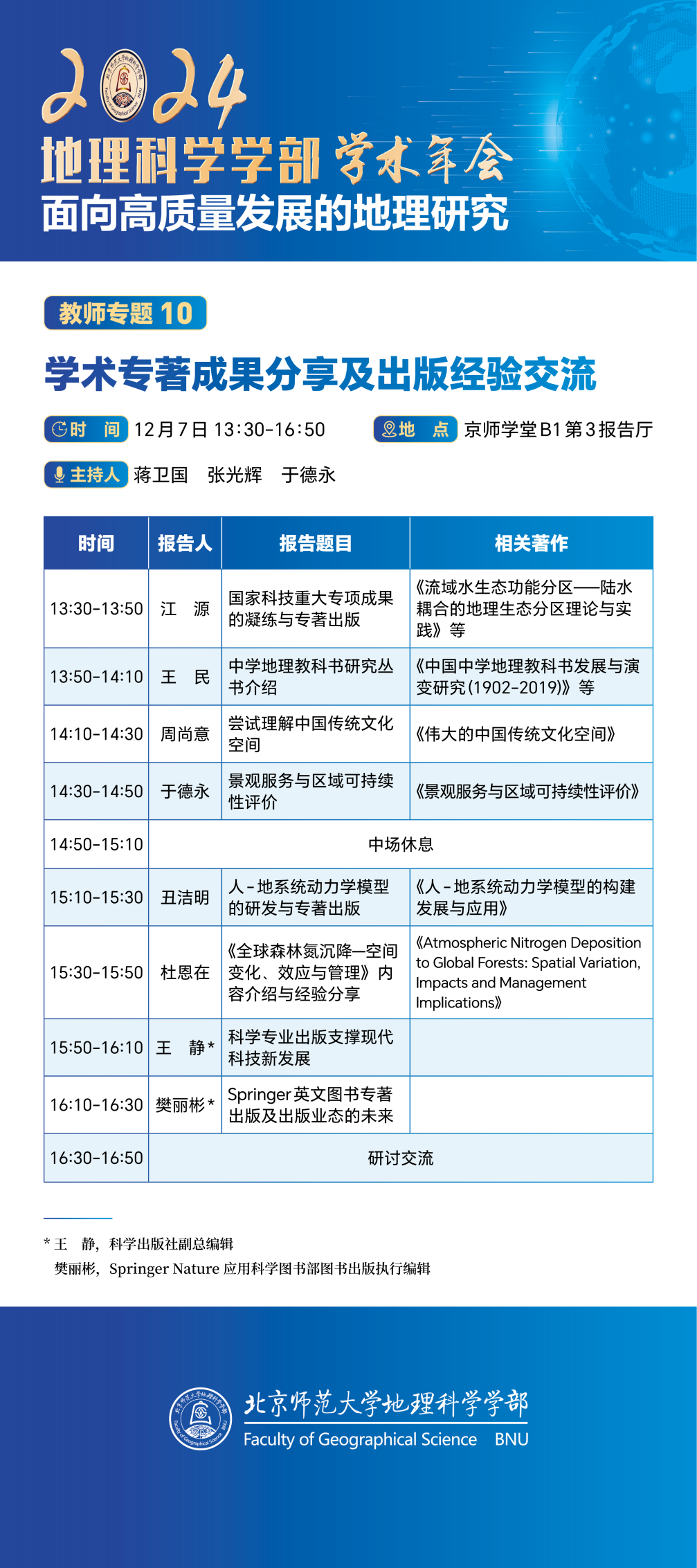 老司机论坛 学术年会以提升师生科学研究水平,促进科研工作高质量发展为目标。近年来,学部教师在地表过程、资源生态、灾害风险、区域可持续发展等领域出版了一系列学术专著。为进一步加强师生研究进展的深入交流,让更多的教师了解学术著作出版的过程,促进科研成果的出版,2024年学术年会将举办“学术专著成果分享及出版经验交流”专题会议。