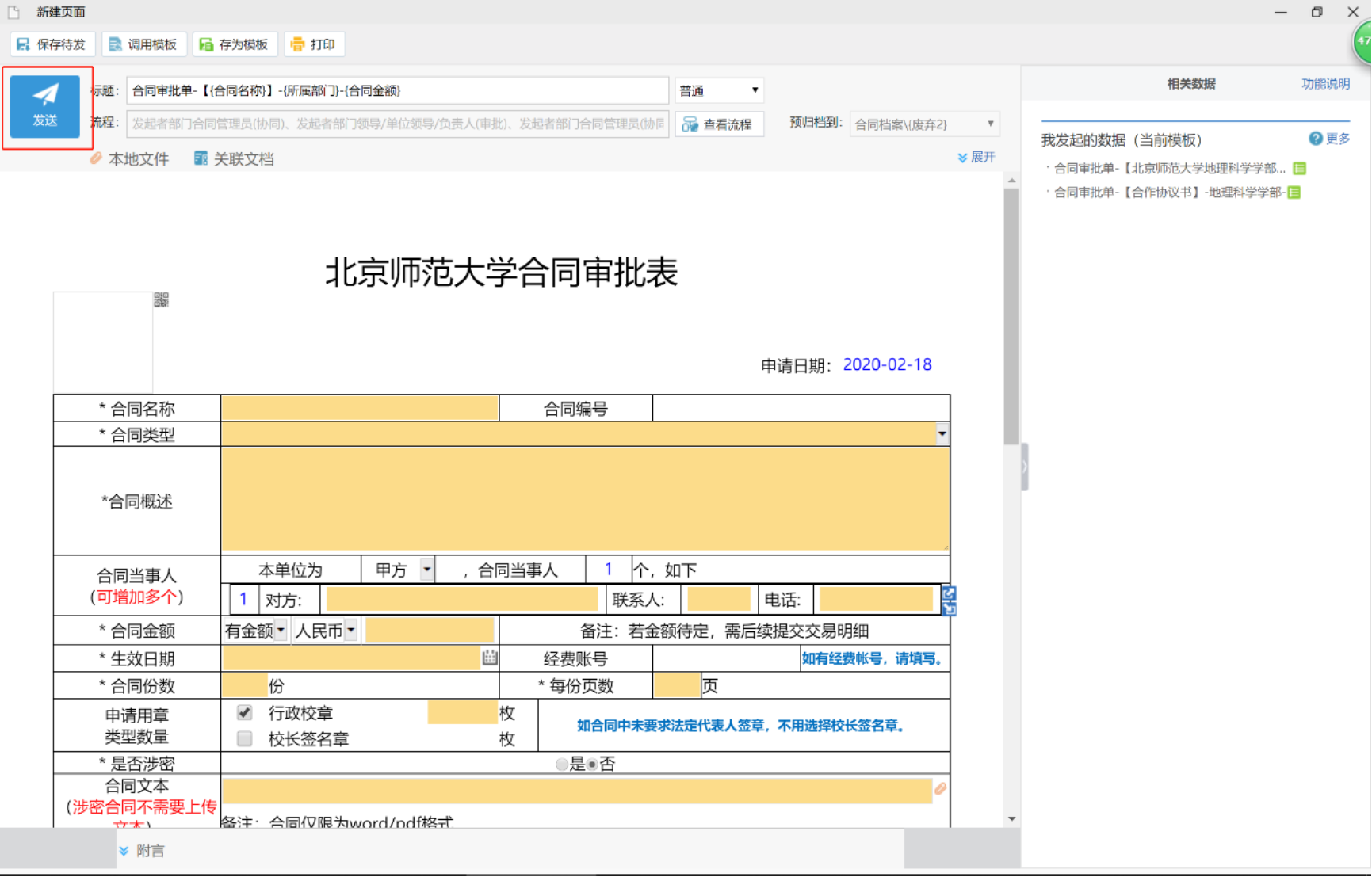 登录信息门户→合同管理系统→合同审批表进入填写,并将合同电子版作为附件上传,信息全部录入完毕后,点击发送即可。