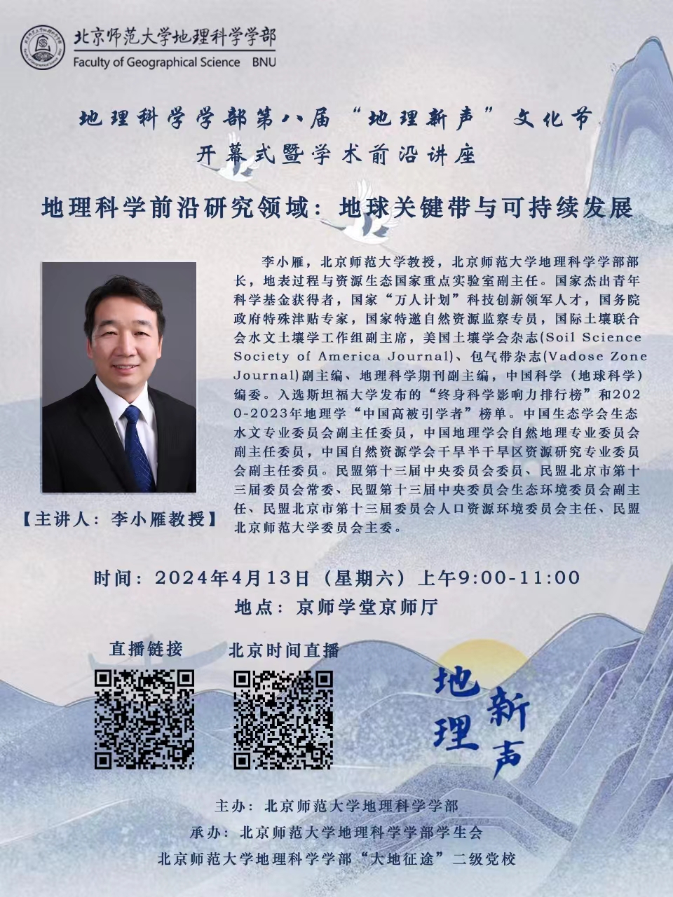 承地理之广大,发时代之新声!老司机论坛 第八届“地理新声”文化节将于2024年4月13日正式拉开帷幕。开幕式暨学术前沿讲座将于4月13日上午9:00于京师学堂京师厅举办,届时,李小雁教授将为大家作题为《地球关键带与可持续发展》的主题讲座。