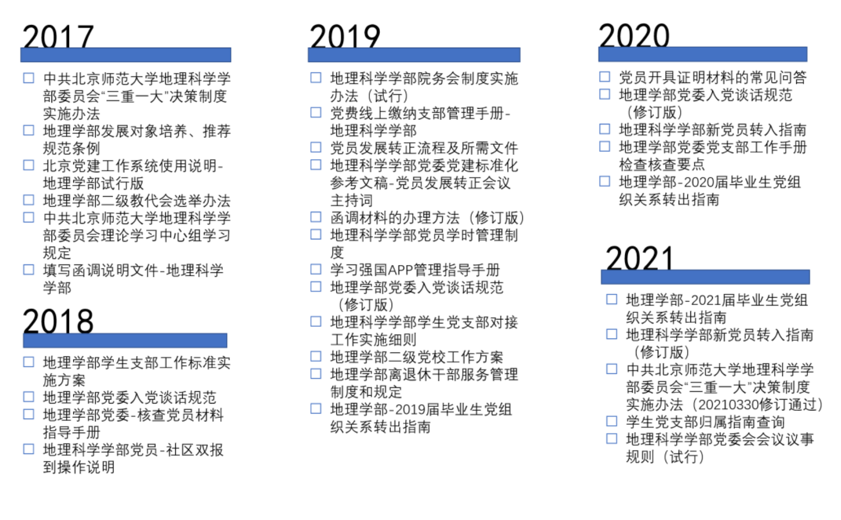 学部党委不断推进标准化建设,结合党员材料自查形成《党员发展转正流程导图》、《党员材料填写必读条目》,并用于规范党员发展及转正工作,近五年共发展379名师生党员(含6名教职工);连续49个月按期完成师生党支部党费收缴及上报工作;按期完成北京市党建平台与校内组织工作管理与服务平台的党员信息维护。