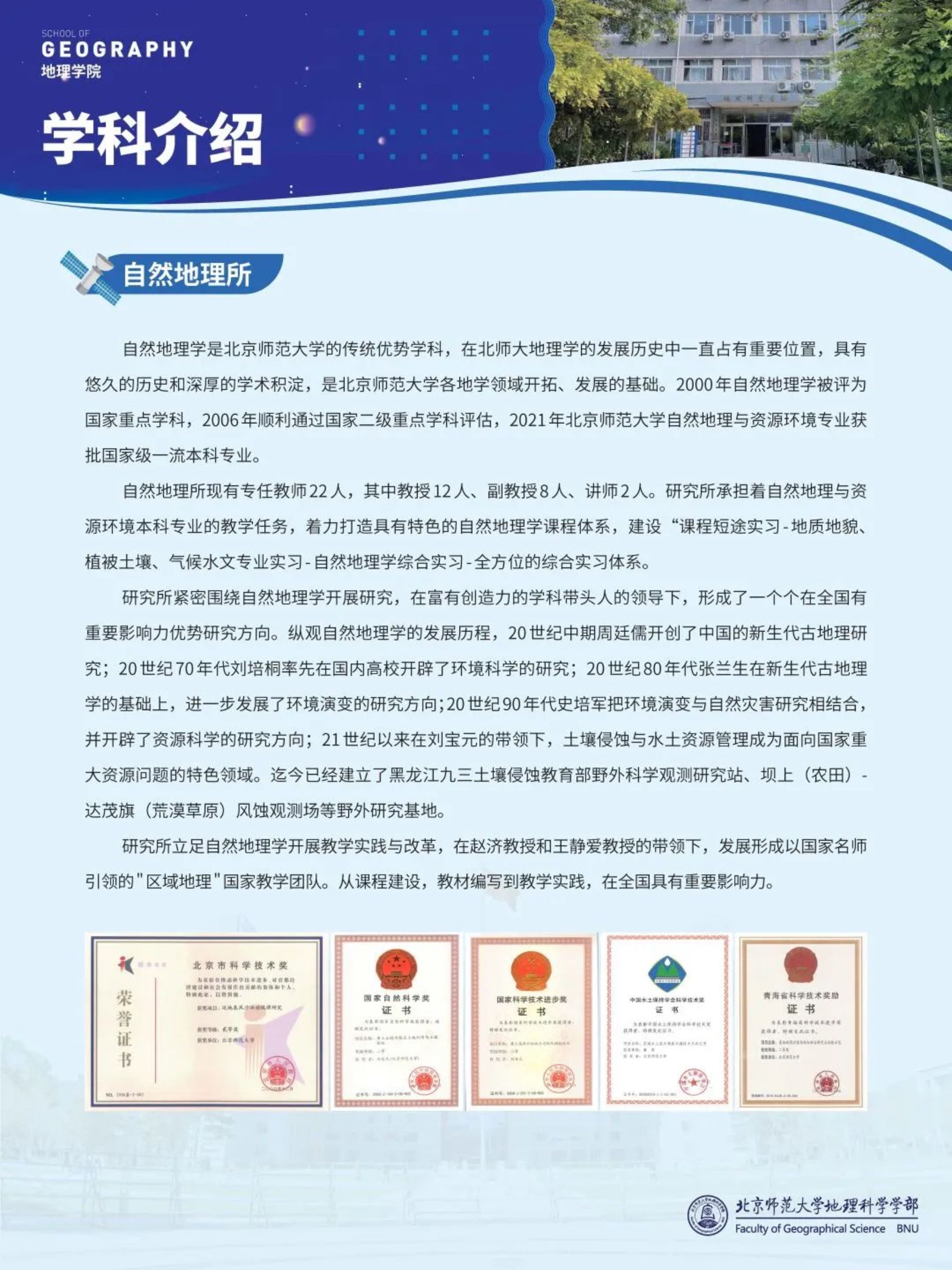 学院武建军教师团队主编了国家科技部发布的《全球重大自然灾害及其影响》和《全球重大自然灾害对植被的影响》等两部专题报告。刘宝元团队作为技术支撑,完成水利部全国水土流失动态监测,九三土壤保持试验站升级为黑龙江九三土壤侵蚀教育部野外科学观测研究站。