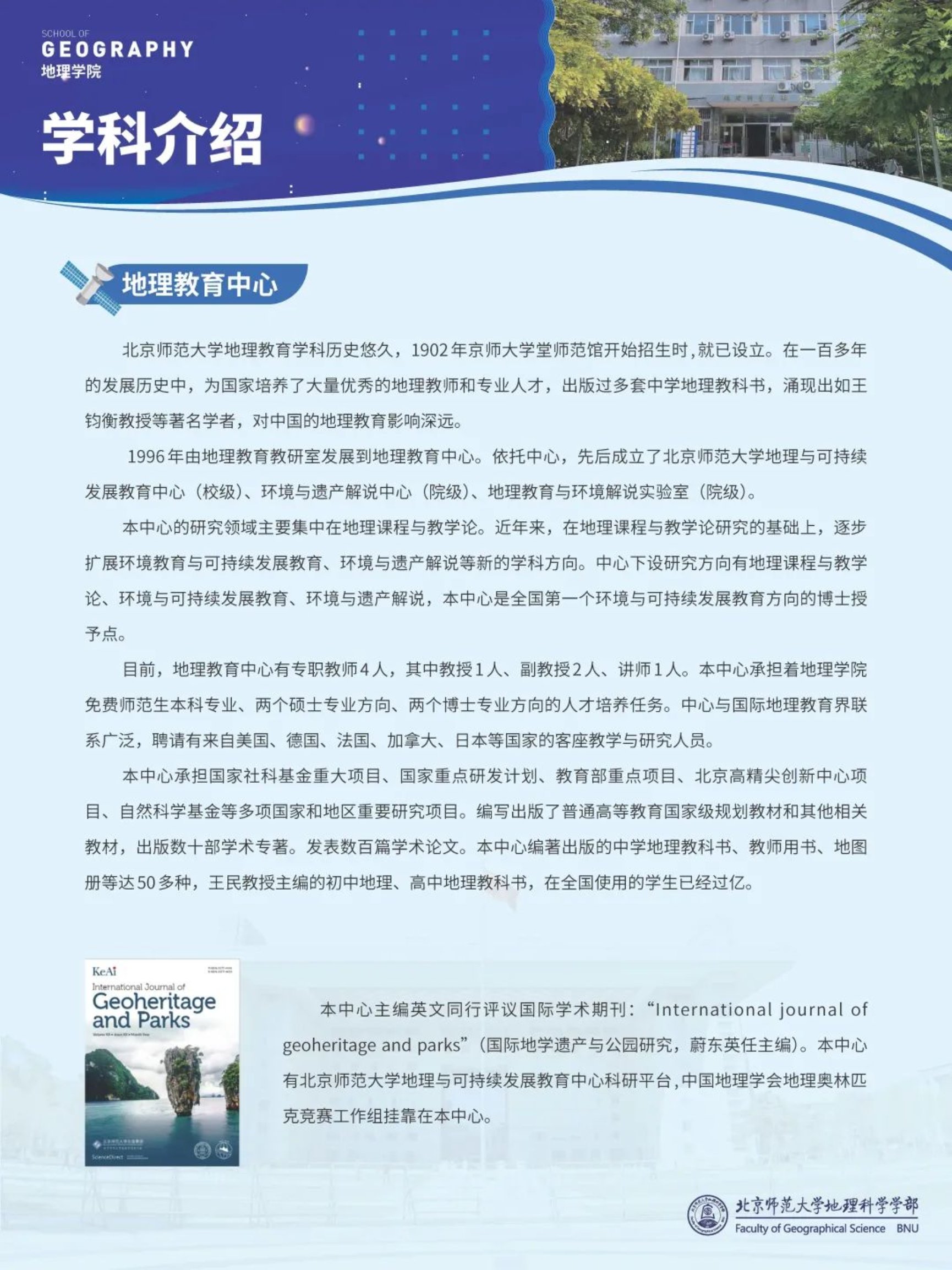 在教书育人的同时,地理学院积极响应国家发展需求,围绕资源、环境、人口与可持续发展开展科学研究,形成了土壤侵蚀、环境演变、区域资源开发与自然灾害、城市与区域发展等优势研究方向,为国家生态文明建设与可持续发展做出了重大贡献。