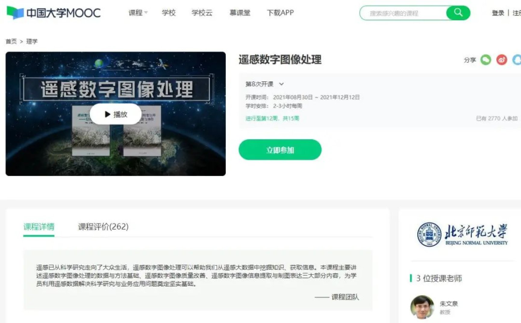 面向学校本科生培养强调通识教育的目标,积极鼓励并帮助青年教师建设了“地理信息系统导论”等8门全校通识课程。鼓励教师建设MOOC,朱文泉教授建设的MOOC课程“遥感数字图像处理”已产生巨大的社会学术影响,已开课8期,累计选课人数3.6万余人。焦子锑教授申报的“遥感数字图像处理基础”在线课程也已完成录制工作。在教学水平提升方面,组织本专业教师研讨主讲专业课之间的知识联系,优化教学内容和教学方法。