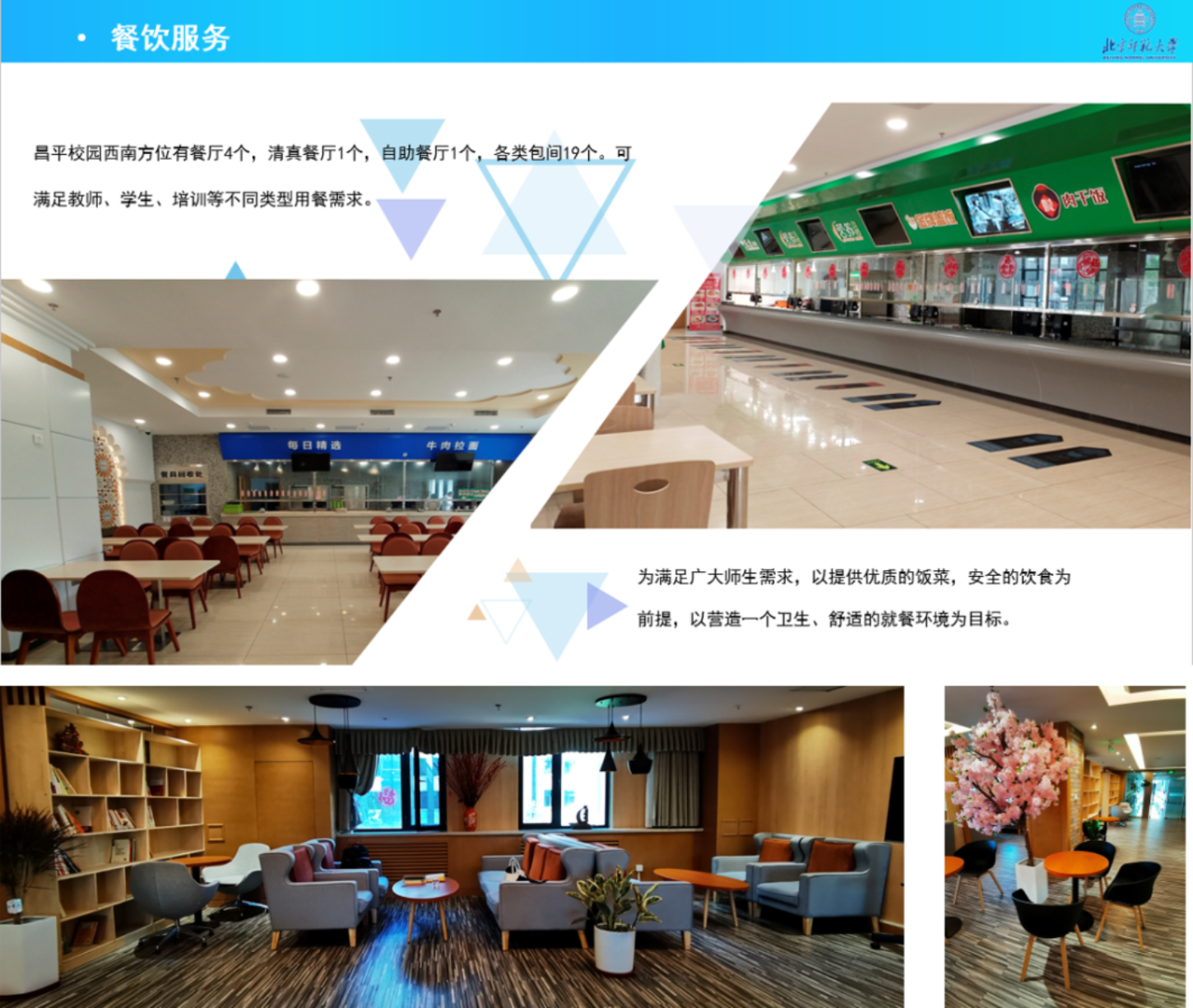 昌平校园G区 邮编:102206 二、 昌平校园校内单位 昌平校园综合管理办公室,1号教学服务楼6层 党委学生工作部(昌平办公室),1号教学服务楼617 图书馆昌平分馆,图书馆1-2层 信息网络中心(昌平办公室),2号教学服务楼104室 校医院(昌平医务室),教师公寓楼1层北区 互联网教育智能技术与应用国家工程实验室,3号教学楼3-5层 未来教育高精尖创新中心,3号教学楼1-2层 继续教育与教师培训学院,1号教学服务楼3层 新兴市场研究院(一带一路学院),1号教学服务楼5层西区 中国扶贫研究院,1号教学服务楼5层 三、 常用电话 昌平校园综合管理办公室办公电话: 行政办公室:58804599 餐饮办公室:58800949 物业办公室:58803004 公寓办公室:58802158 安保办公室:58804568 教学办公室:58806086 场馆办公室:58802959 昌平校园其他职能部门办公电话: 学工办公室:58802928 图书馆:58804948 医务室: 58802068 信息网络中心:58802046 各楼宇物业值班台联系电话: 报警电话:58800904 (24小时) 1号学生宿舍:58807148 物业报修:58802234 3号男生宿舍:58802115 消防中控室:58804339 3号女生宿舍:58802155 图书馆前台:58802892 5号留学生宿舍:58800989 体育馆前台:58804277 1号教学楼:58804338 报告厅前台:58800081 2号教学楼:58804053 北门值班室:58804186 四、 公共服务时间 通勤车日常时刻表(9月6日起运行) 工作日通勤车 昌平校园→ →校本部 校本部→→昌平校园 上午 6:30 6:45 7:30 7:30 8:30 8:30 12:00 12:00 12:30 下午 14:00 14:00 16:35 16:35 18:00 18:00 19:00 20:00 20:00 21:00 21:00 22:00 22:00 23:00 周末通勤车 昌平校园→ →校本部 校本部→→昌平校园 7:00 上午 7:30 8:30 9:30 9:30 12:00 12:30 下午 14:00 14:00 16:00 16:00 18:00 18:00 20:00 20:45 21:00 22:00 23:00 食堂 学生食堂用餐时间 早餐 07:00-09:00 午餐 11:00-13:00 晚餐 17:00-19:00 支付方式:校园一卡通 就餐地点:学生食堂一层、二层、清真食堂 异国他乡咖啡厅 周一至周日10:00-22:00 支付方式:异国他乡点单支付 就餐地点:1号连廊南端 图书馆及自习室 楼宇 位置 开放时间 图书馆 图书馆1层、2层阅览室,研讨室、机房 8:00-22:00 教学楼 1号教学楼、2号教学楼1-2层专用自习室 6:00-23:00 中心地下区 B3层、B4层学习区 8:00-22:00 体育场馆 项目 位置 开放时间 羽毛球馆 体育馆一层 8:00-22:00 健身房 体育馆二层 8:00-22:00 篮球馆 体育馆三层 8:00-22:00 游泳馆 体育馆B1层 周一至周五12:00-14:00, 周一至周日18:00-22:00 乒乓球、台球室 2号教学楼B1层 8:00-22:00 超市、快递 名称 营业时间 地点 京东超市 7:00-23:00 3号学生宿舍南侧 京东超市复印社 7:00-23:00 京东超市内 近邻宝 8:00-19:00 京东超市内 五、 生活指南 1、 周边情况 沙河高教园共有7所高校,北师、北航、矿大、外交、央财、北邮、北科,彼此相邻。于我校相邻的学校是北边的矿大和东边的北航,距离我校最近的商业餐饮集中点,是地铁昌平线沙河站周边,从昌平校园东门外乘坐C116路公交车可以直达。 2、 通勤车(新生必看!!) 为方便同学往返两校园,学校在每天6:30至23:00期间开设多趟通勤车次供同学免费乘坐。通勤车在校本部的上下车地点为中西门(邱季端体育馆和西操场西侧),在昌平校园的上下车地点为昌平校园行政楼(1号教学服务楼)北侧、衡芷园餐厅门口。 9月5日迎新日当天,乘坐迎新通勤专车不需要预约。从9月6日起,乘坐通勤车均需要提前预约。目前只有在昌平校园学生以及部分教学科研管理工作与昌平校园联系较密切的老师有预约资格。 通勤车单程到达时间,一般在40分钟到60分钟之间,早高峰进城的通勤车遇极端堵车情况可能会耗时80分钟。 预约步骤: 微信-北师大微信企业号-昌平校园通勤车预约系统-约车/车票(可以查看剩余座位)-选择日期班次-预约成功-上车出示乘车码 车票查看及出示、取消: 昌平校园通勤车预约系统-约车/车票-右下角“我的”-我的预约-查看约车信息或操作 升学前为北师大毕业生的同学如何操作: 微信-北师大微信企业号-解绑原学号-退出企业号-退出微信账号-重新登录微信-北师大企业号-用新学号重新绑定-昌平校园通勤车预约系统 乘车须知: 1. 已预约成功的师生,按抵达乘车地点的时间先后排队候车。 2. 上车时,请向司机出示车票二维码,扫码成功后上车。上车后请系好安 全带,请勿为未上车人员提前占座。 3. 请师生至少提前10分钟抵达乘车地点。超过发车时间抵达乘车地点,视为无票。 4. 无车票的师生请先在乘车地点排队等候,待有票师生上车完毕后,如有空座,按排队顺序,扫码(带有红色外框)上车,坐满为止。未能乘车的师生请自行解决出行需求。 5. 不能提供二维码的,谢绝乘车。 注意事项: 1. 由于跨校园的师生人数较多,请同学在乘车时务必遵守秩序,注意安全。目前的车次和车辆数是我们根据前一段时间乘车人数统计数据做出的安排。车次一般不调整,车辆数会根据需求做调整。 为有效使用车辆,通勤车每个时间段除最后一辆车外,前车必须坐满后方可发车,请大家按排队顺序上车,不能自由选择车辆。 2. 请师生根据自身需求,尽量提前预约车票。早高峰时间段为:昌平至本部,早上6:30-8:30,请在前一天晚上22:00之前提交预约申请;晚高峰时段为:本部回昌平,晚上21:00-23:00,请提前三小时提交预约申请。 如果提前出现某一班次座位已约满的情况,在时间允许的情况下,会临时增加车辆,如时间来不及,无法增加车辆,会出现排队候补师生不能按计划乘车的情况。 3. 预约成功后