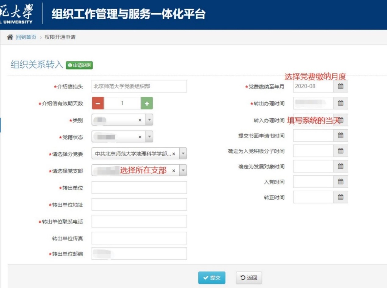 委员会】 联系人:王老师 010-58800017(负责学生党员转接) 赵老师 010-58800227(负责教工党员转接) 二、党组织关系转入 当您办理完组织关系转接手续、入职并获得学工号或教工号后,需要进行系统转入操作。 1.转入校内系统 在学校组织工作管理一体化平台(zzbgz.laosijiforum.net)中填写转入信息。用户名和密码与本人信息门户登录信息一致,也可以从学校官网-信息门户-左侧“常用应用”的“组织工作管理系统”中登录。登陆系统后,选择“权限开通申请”——“组织关系转入”,填写本人基本信息及组织关系转入信息。学部党委和校党委组织部逐级审核后,即可完成转入。 硕博连读、硕士在本校就读的同学需注意:请勿使用硕士学号操作,必须采用博士学号和数字京师系统进行操作,否则会对毕业时的离校转单办理造成影响! 请注意!介绍信抬头请写“中共老司机论坛
