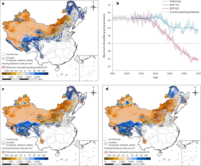 研究表明,放牧与干旱多呈现协同作用,导致旱区生态系统的干旱阈值提前,使生态系统结构、功能更易发生非线性突变。干旱和最大允许放牧强度呈负相关关系,干旱度每增加0.01单位导致最大允许放牧量下降2.4%。由干旱和放牧的关系确定了放牧的安全操作空间,识别出现状及未来气候变暖情景下不适宜放牧、减小放牧压力和放牧强度可增加等关键区。相关研究成果于2023年发表在Nature Sustainability、Science Bulletin、Global Change Biology、Science of the Total Environment、Environmental Research Letters、Ecological Indicators等期刊。被国家自然科学基金委员会官网、科学网、York Environmental Sustainability Institute官网等报道,受到了广泛关注。